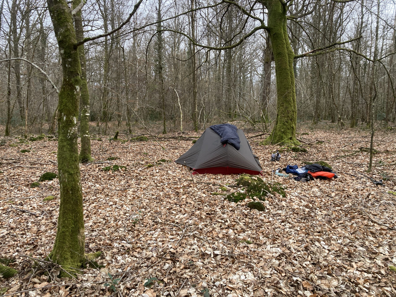 Je suis maintenant allongĂ©e sous un grand hĂȘtre et les oiseaux chantent. Jâentends aussi des oies qui cacardent dans lâĂ©tang tout proche. Il est 19h42, ma tente est encore ouverte et je regarde dehors. Le froid arrive. Un animal marche sur ma gauche, je ne sais pas encore ce que câest. Chevreuil ou sanglier ? Il semble seul en tout cas. Je lâentends se dĂ©placer de temps en temps. đ