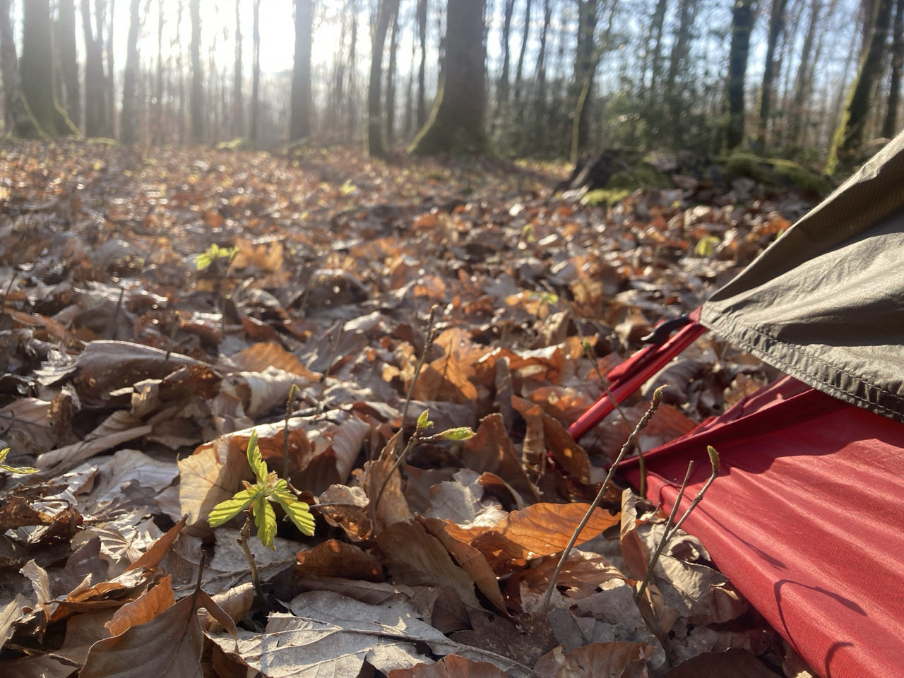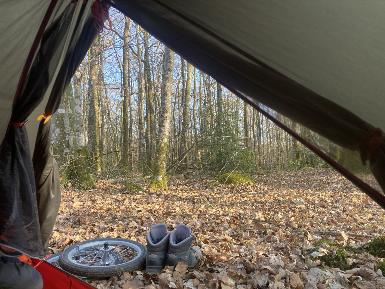 ❄️ Bénédicte me dit qu’il a gelé ce matin chez elle à une trentaine de kilomètres. Ici, sous la forêt, pas de gel, aucune trace de rosée ni de condensation. Ma tente est sèche.