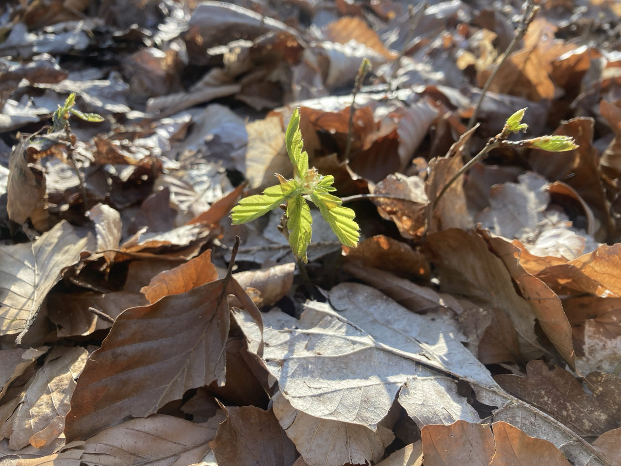 Avec la lumière rasante du matin, j’aperçois tous les petits insectes qui voletent au-dessus du tapis de feuilles. Le printemps arrive. Pour moi qui ai l’habitude des forêts l’hiver, la danse de ces petites taches lumineuses est fascinante.