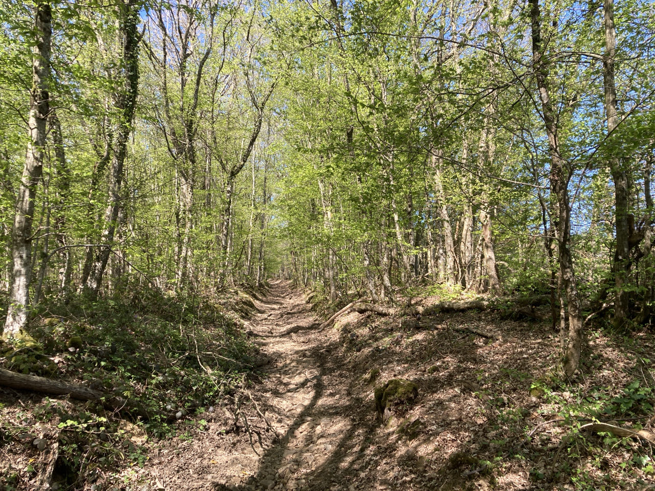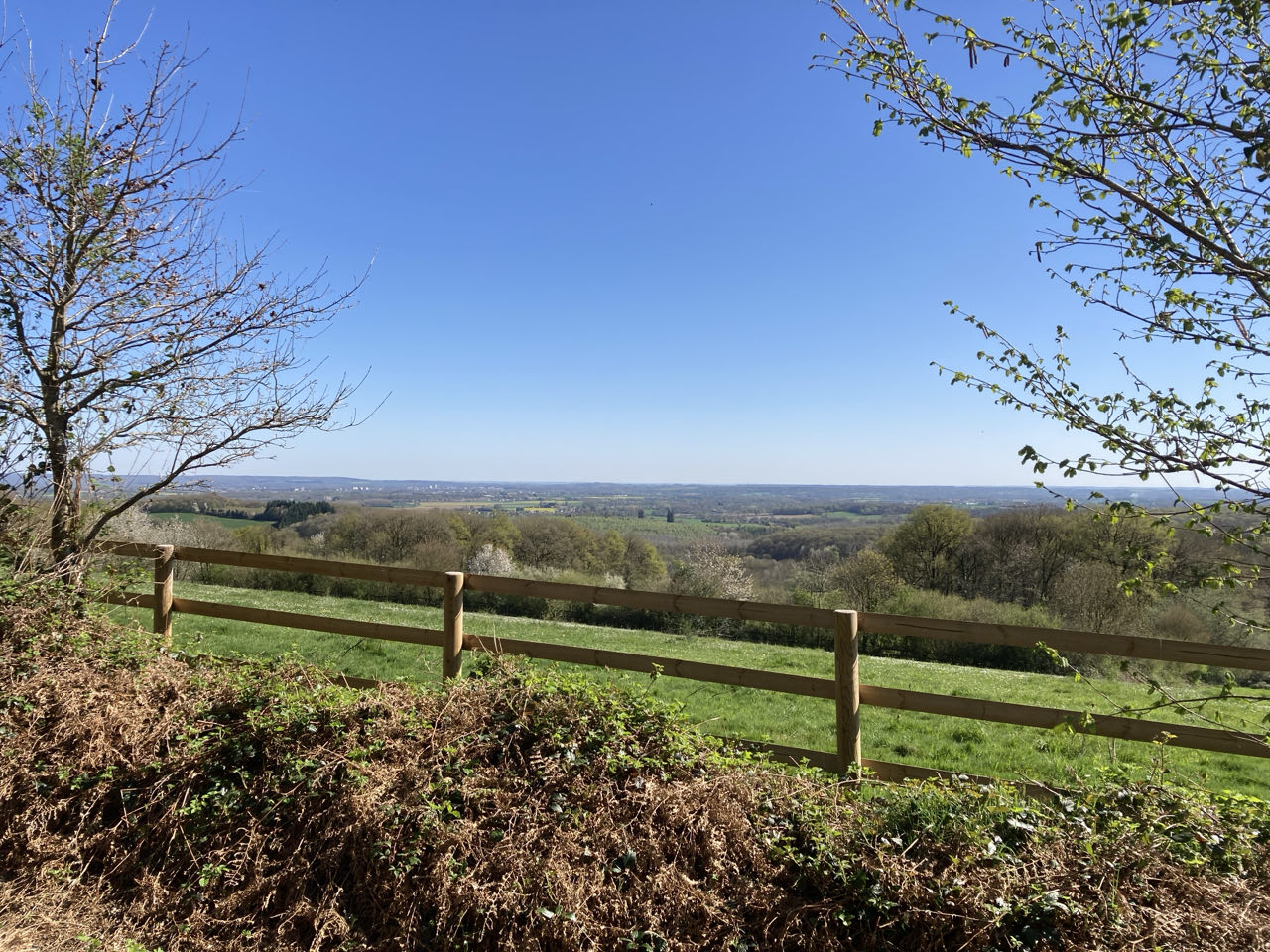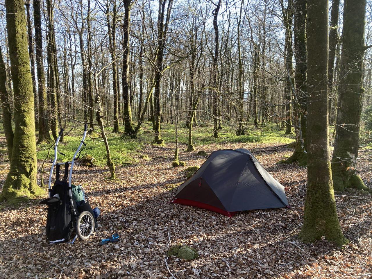 Mauvaise humeur au téléphone, chemin entre les haies, des chevaux qui galopent 🐎, point de vue, tracas avec la chariotte qui grince, ruisseaux, prairies, forêt, le GR disparaît avec la coupe rase d’une parcelle, étape plus longue que prévue, fatiguée, deux gros chiens ont peur et m’aboient dessus, rappel inutile du propriétaire qui finit par crier « elles aboient mais elles mordent pas » super 🤨, ces gens m’énervent, lavée à l’eau trop chaude, bon repas (semoule de sarrasin, une courgette, tomates séchées, raisins secs, graines variées), il fait doux, j’ai mangé dehors et non pas sous ma tente, j’ai entendu mon premier coucou, je vais dormir au milieu des myrtilles 🫐, les arbres bourgeonnent, bientôt les feuilles cacheront le ciel, je n’ai pas démonté Rouletab, elle dort dehors cette nuit pour la première fois ✨, épuisée.