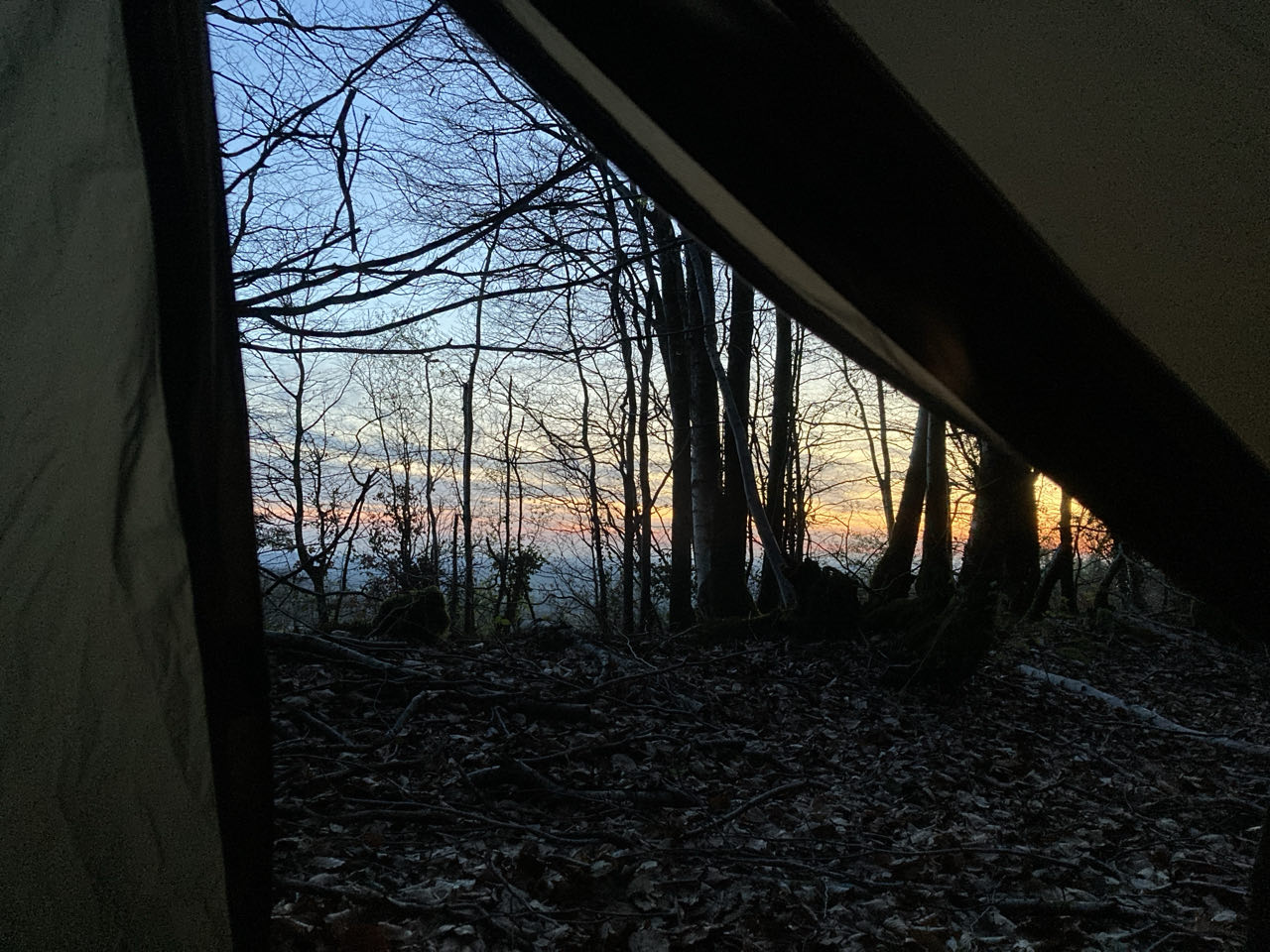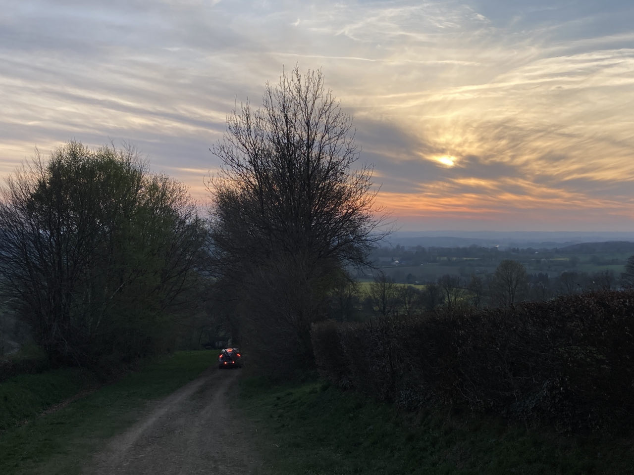 Les feux de la voiture de Bénédicte et Rickey disparaissent entre la masse sombre des arbres. Il.elle sont venus me rejoindre pour la fin de la journée, l’occasion d’une balade à vélo, de m’apporter des vivres et d’un pique-nique avec le soleil couchant ! C’était super 😊 L’endroit que j’avais repéré sur la carte offrait un magnifique point de vue. Pour bivouaquer, c’est moins pratique : je suis juste à côté du chemin en bordure d’une plantation de résineux, ça fera bien l’affaire ! Ces grands arbres sombres me protègent bien du vent.