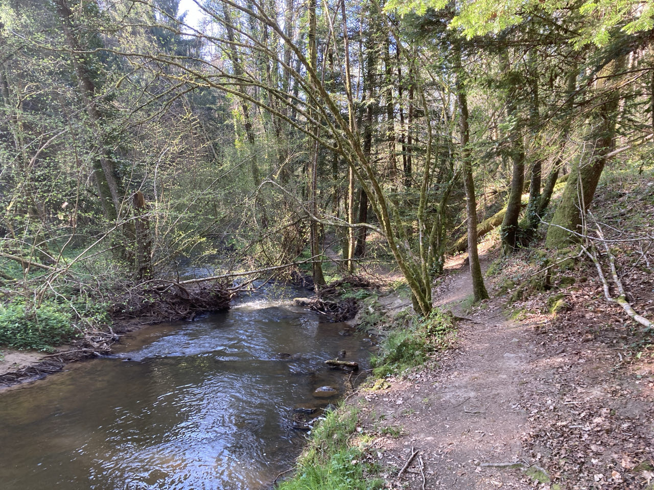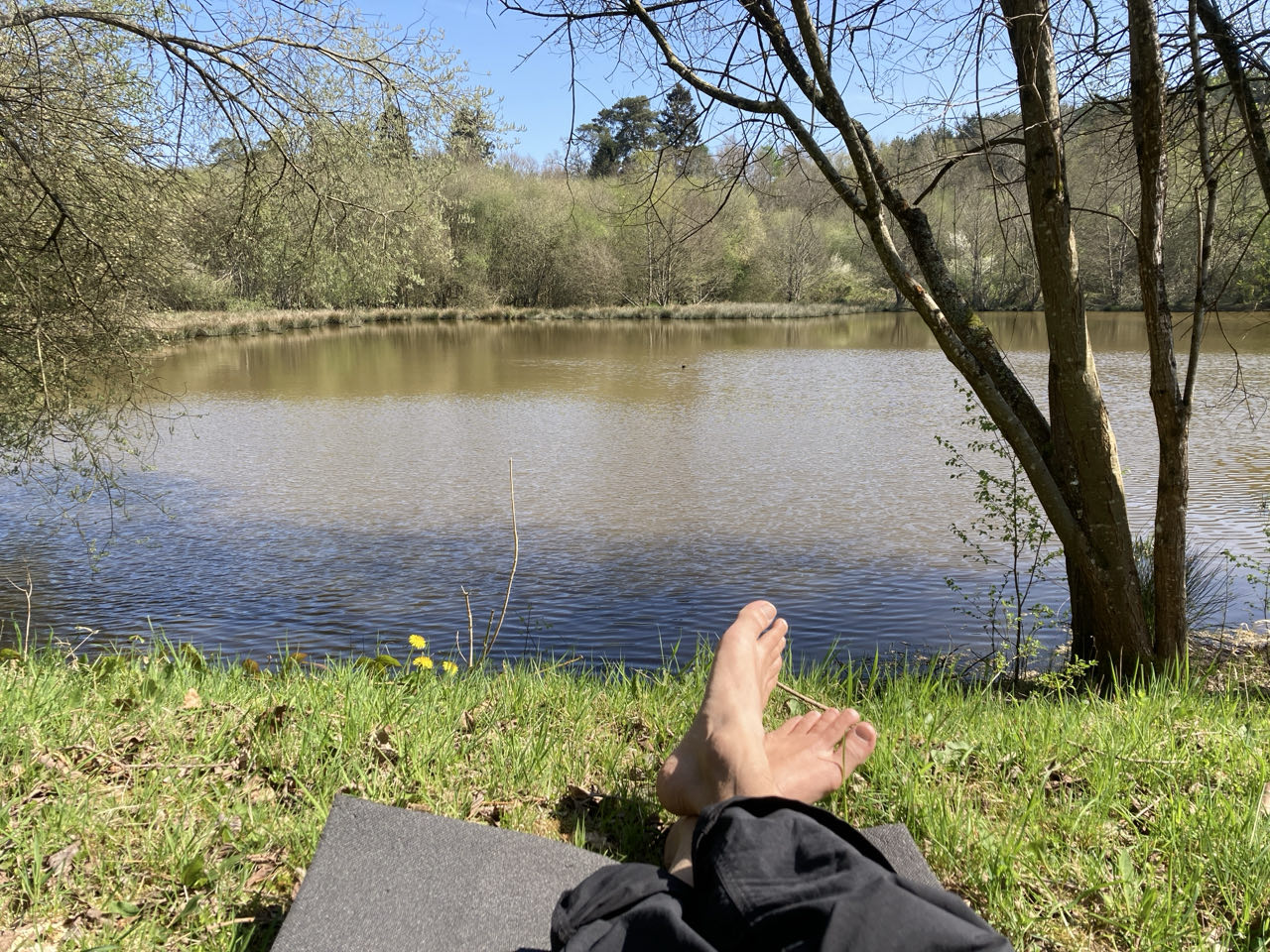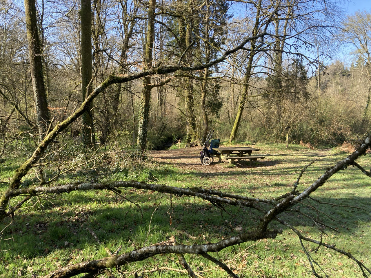 Il est 13h et j’ai fini de pique-niquer au bord d’un étang dans la vallée de la Cour. Il y a du vent et j’ai remis ma doudoune.