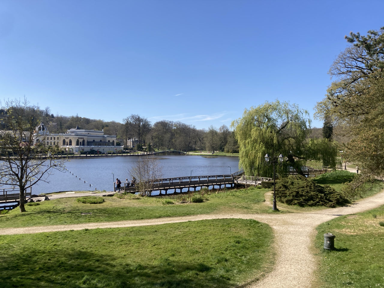 17h15. Je me suis arrêtée dans le parc du château de Bagnoles de l’Orne Normandie. 🏰 Je charge mon téléphone sur ma batterie externe. Je voulais m’arrêter pour boire une grenadine mais les terrasses des cafés étaient toutes proches des routes. Le flot ininterrompu de la circulation m’a ôté toute envie de m’arrêter. Sinon, la ville est… chic. Un peu trop à mon goût. Un lac, un grand parc, une cure thermale, un casino et pas mal de magasins, soit raffinés soit pour les touristes ! Ça me rappelle un peu Annecy, mais en version normande ! Et y’a aussi les énormes maisons 🏡
