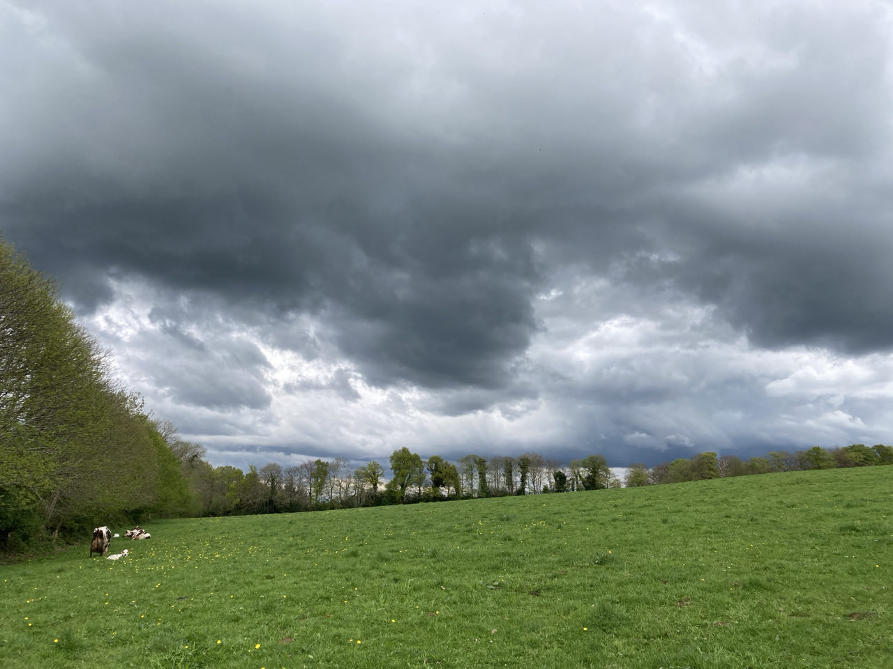 C’est une soirée intégralement sous la tente… Il pleut sans interruption depuis 16h. J’ai planté sous la pluie. C’est la première fois depuis mon départ que je ne profite pas du tout de mon lieu de bivouac. Même sortir faire pipi est une expédition en soi ! Heureusement, grâce à Rouletab j’ai maintenant un second pantalon, ce qui m’évitera de remettre celui qui est trempé demain ! Avant l’arrivée de la pluie, les couleurs du ciel étaient superbes.