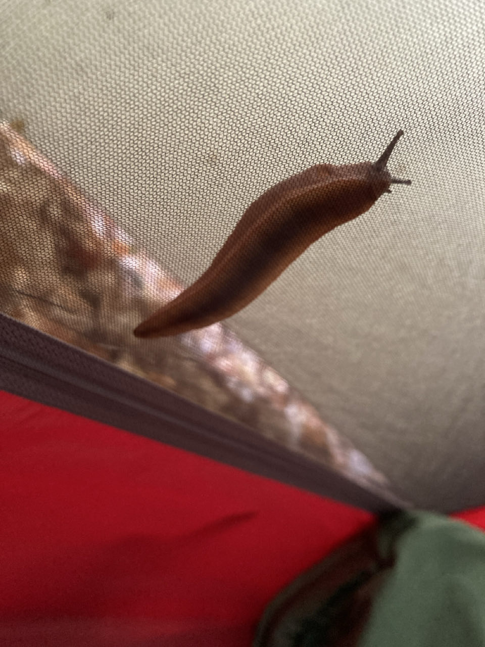 Il pleut ces derniers jours. Les limaces sont de sortie ! Elles se baladent partout, sur la tente, sur Rouletab et jusque dans mes chaussures. 😅 Heureusement qu’elles bavent et que j’ai le réflexe de secouer mes chaussures avant de les enfiler le matin, sinon j’en aurai écrasé une ou deux… 😬