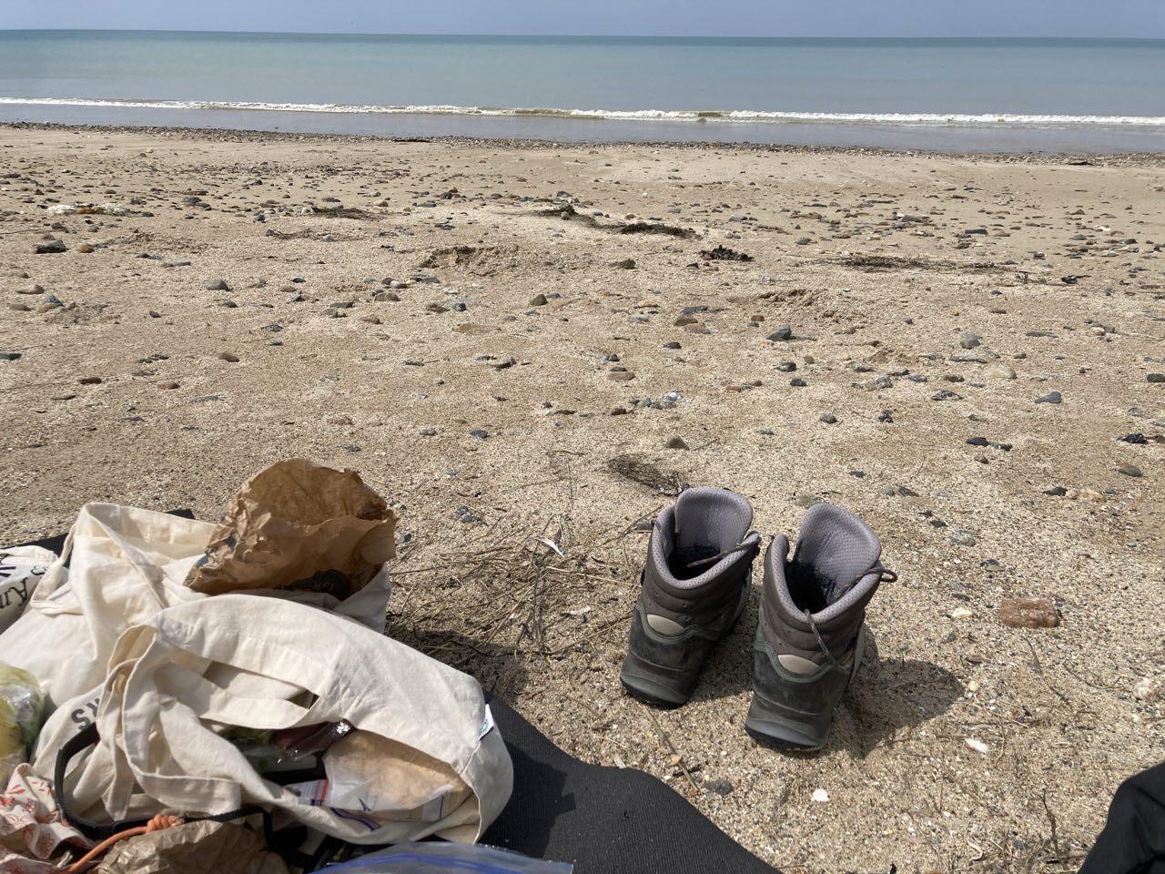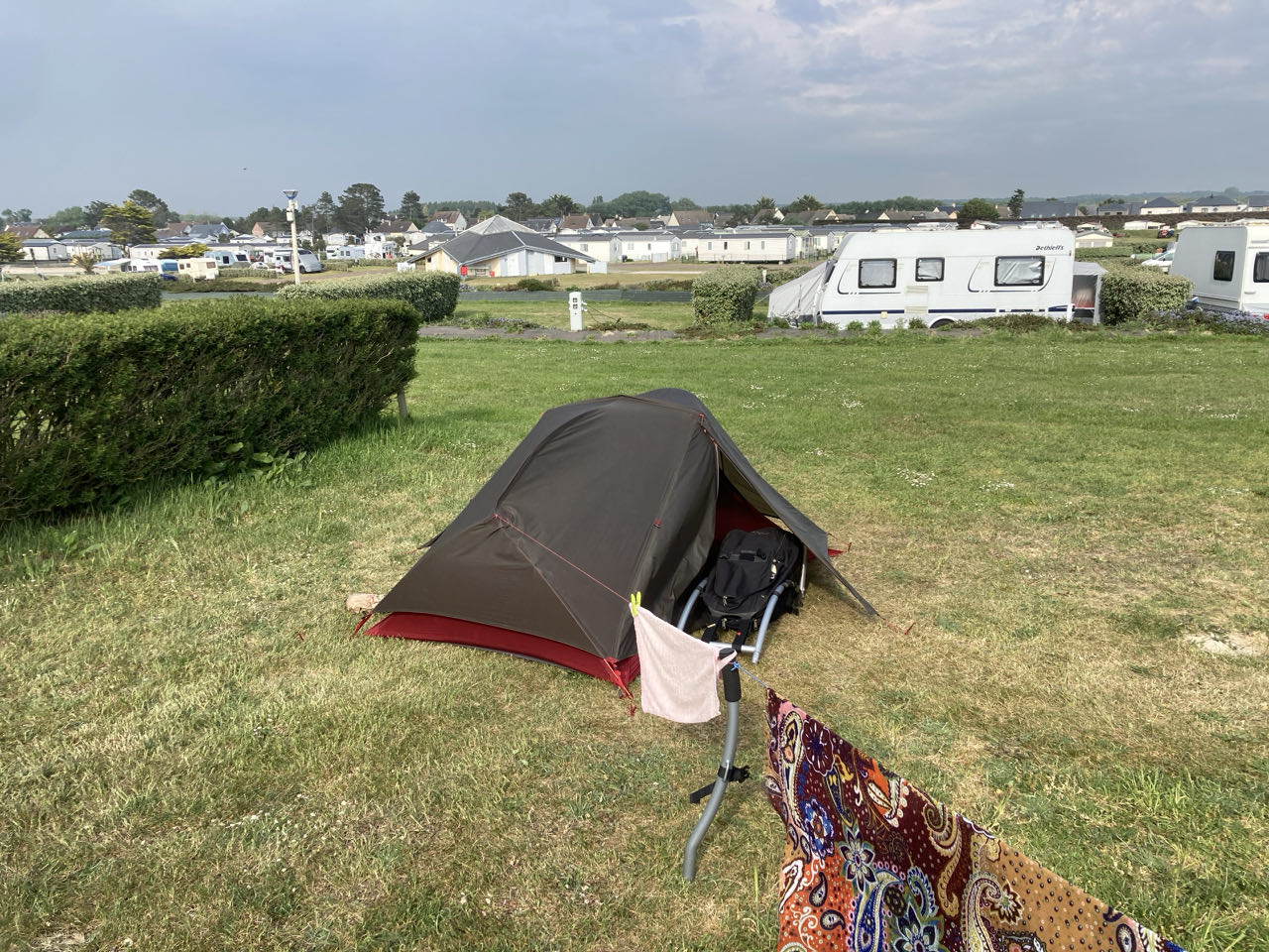 Nuit au camping de Pirou. Ce n’est vraiment pas le type d’endroit que j’apprécie : énorme avec piscine, aucun arbre, des gens parfois bruyants, mais j’ai retrouvé Marianne, et ça, c’était super chouette ! Je m’étais arrêtée chez elle au jour 53. Marianne travaille au West, un resto / cabane de plage très sympa installé dans de grands conteneurs bleus. En plus, j’ai bien mangé 😃 Les frites étaient croustillantes, c’était merveilleux. 🍟⛱️ Et heureusement, le camping n’était pas cher et j’ai trouvé un emplacement plutôt isolé.