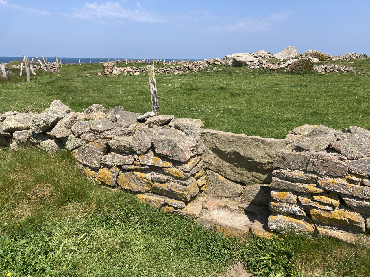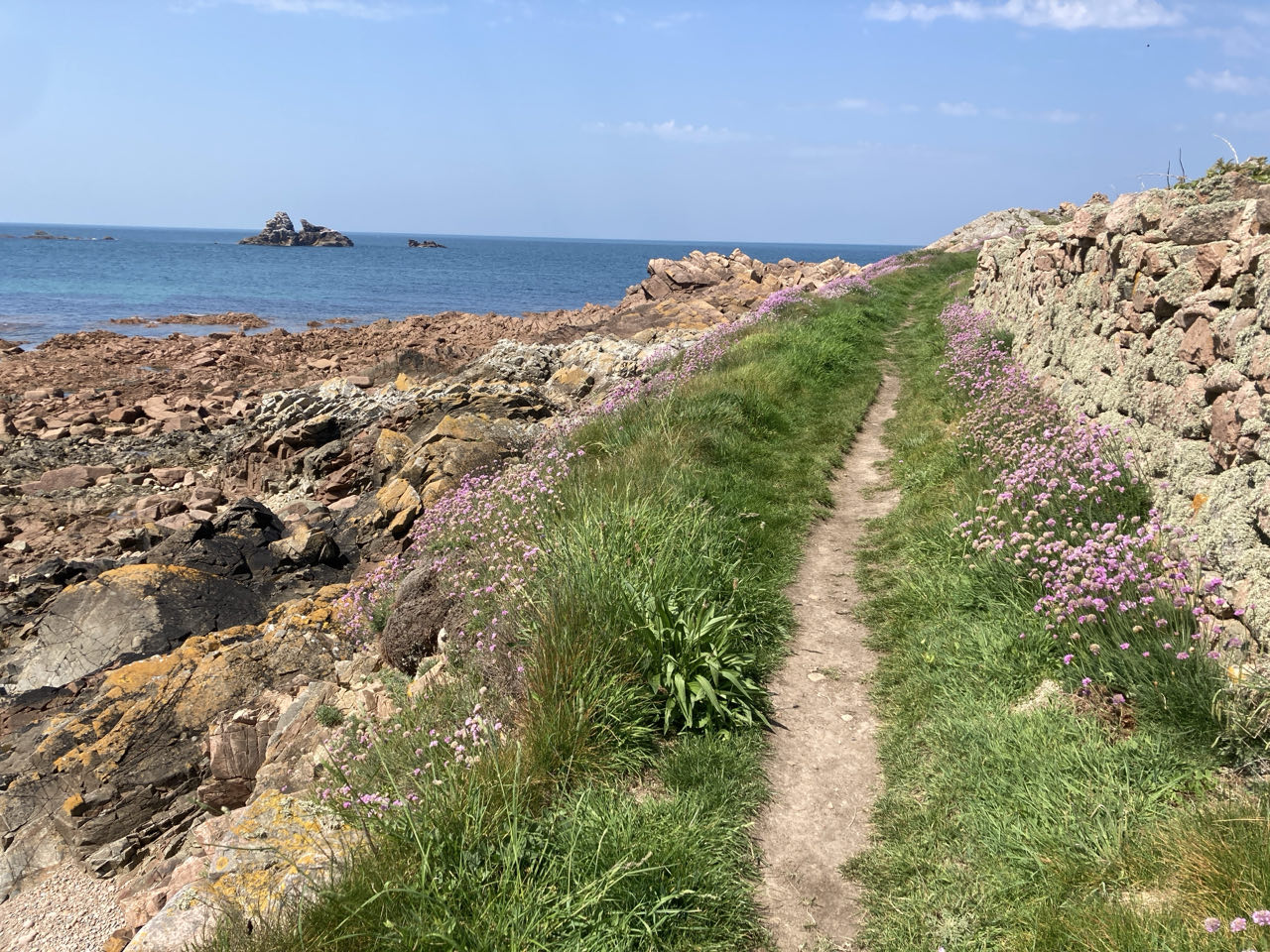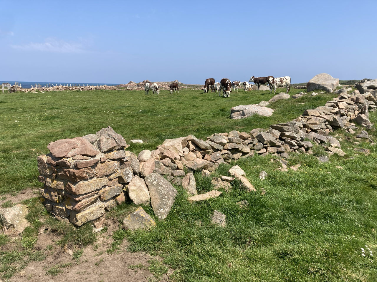 Ensuite, ce sont des prés avec des vaches et des bouquets de fleurs roses (armérias maritimes). Je porte Rouletab souvent pour franchir les passages en pierre entre les prés.