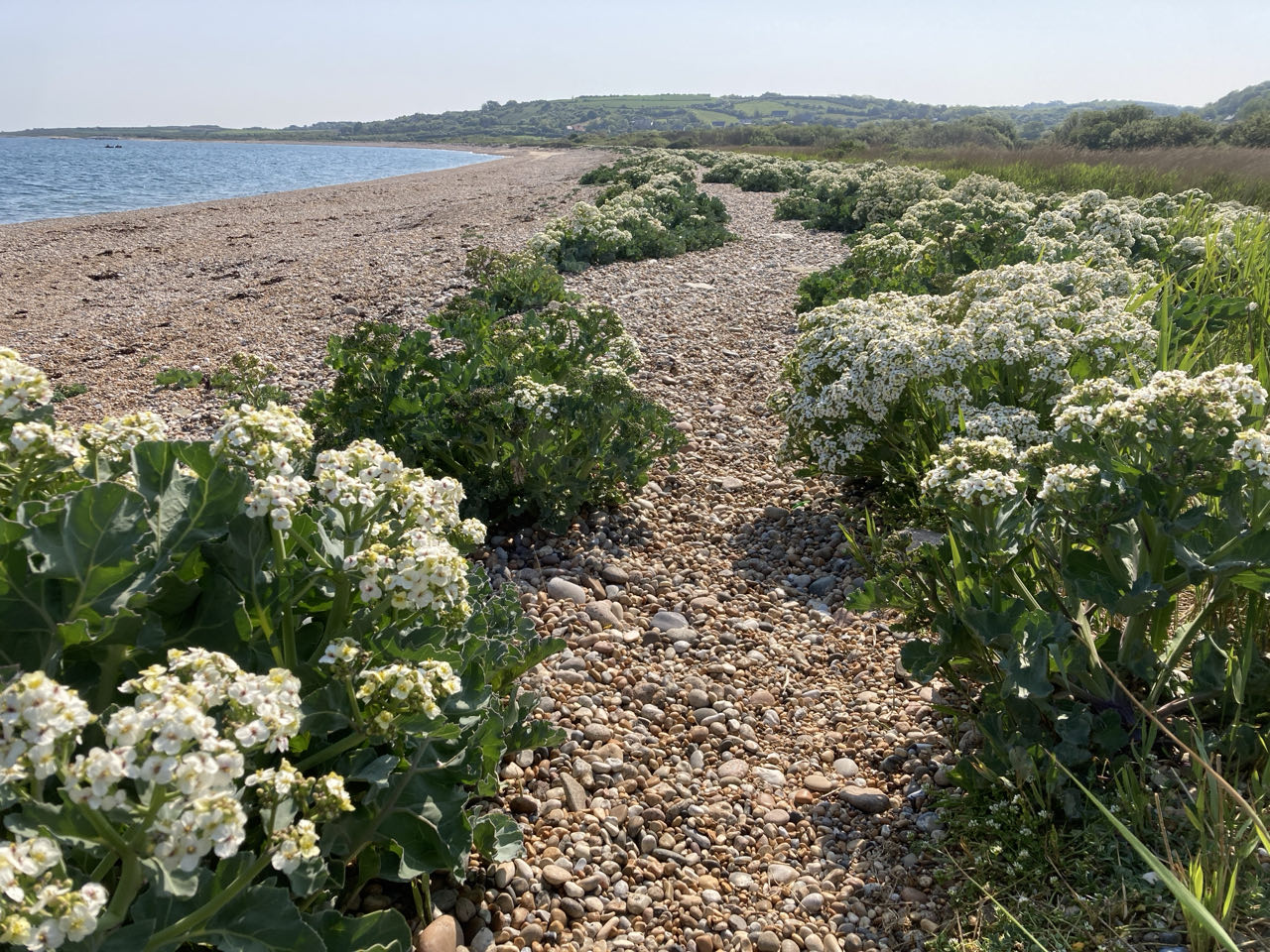 Superbe portion en quittant Port racine sur des galets au milieu des choux maritimes en fleur. 🤩 Je m’arrête sans arrêt pour admirer les reflets violets sur les feuilles et les grappes de fleurs blanches.