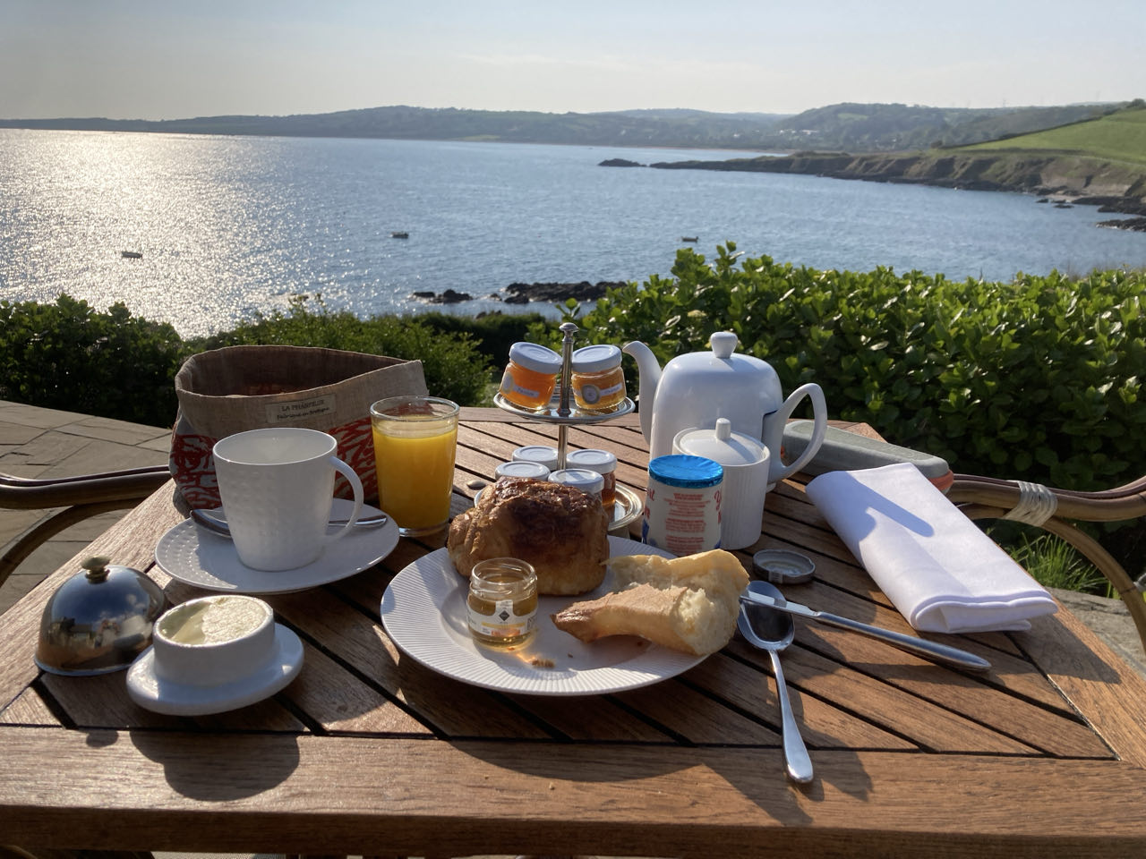 Le monsieur revient avec des couverts étincelants, une serviette immaculée, une panière avec de multiples pains, des petits pots de confiture cerise, framboise, abricot, passion, orange, etc., du miel 🍯 🤩, un yaourt, un jus, une grande théière bien chaude. Voilà, je crois que tout y est ! Ah non, j’ai oublié le croissant et le pain au chocolat 😁