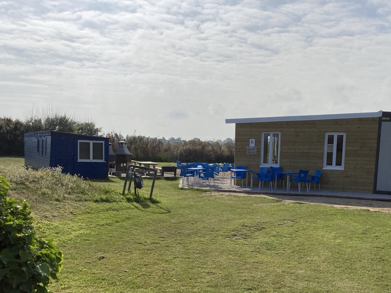 18h. Le sentier de randonnée borde le haut de la plage. Sur ma droite, une trouée dans une haie basse permet d’entrer dans un camping. Juste au-dessus, un drapeau flotte au vent « buvette du camping ouverte à tous ». 🏳️ Je m’avance vers une terrasse occupée par un mobilier en plastique d’un bleu éclatant. Couleur Miko, les glaces Miko. 🔵 Je ne sais pas où est la réception et je demande à une dame assise dehors qui ne parle pas français. Je comprends que le propriétaire est dans la buvette.