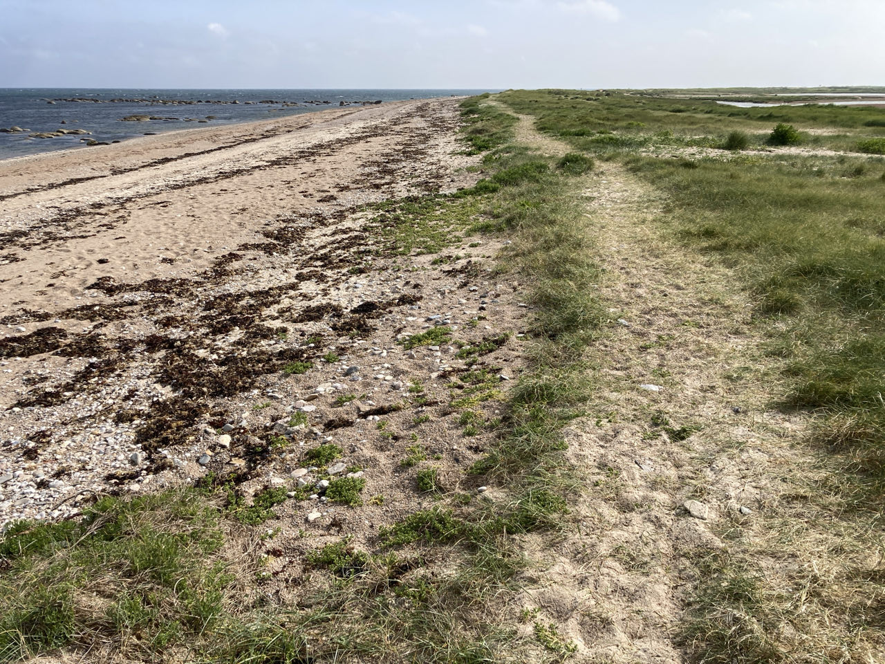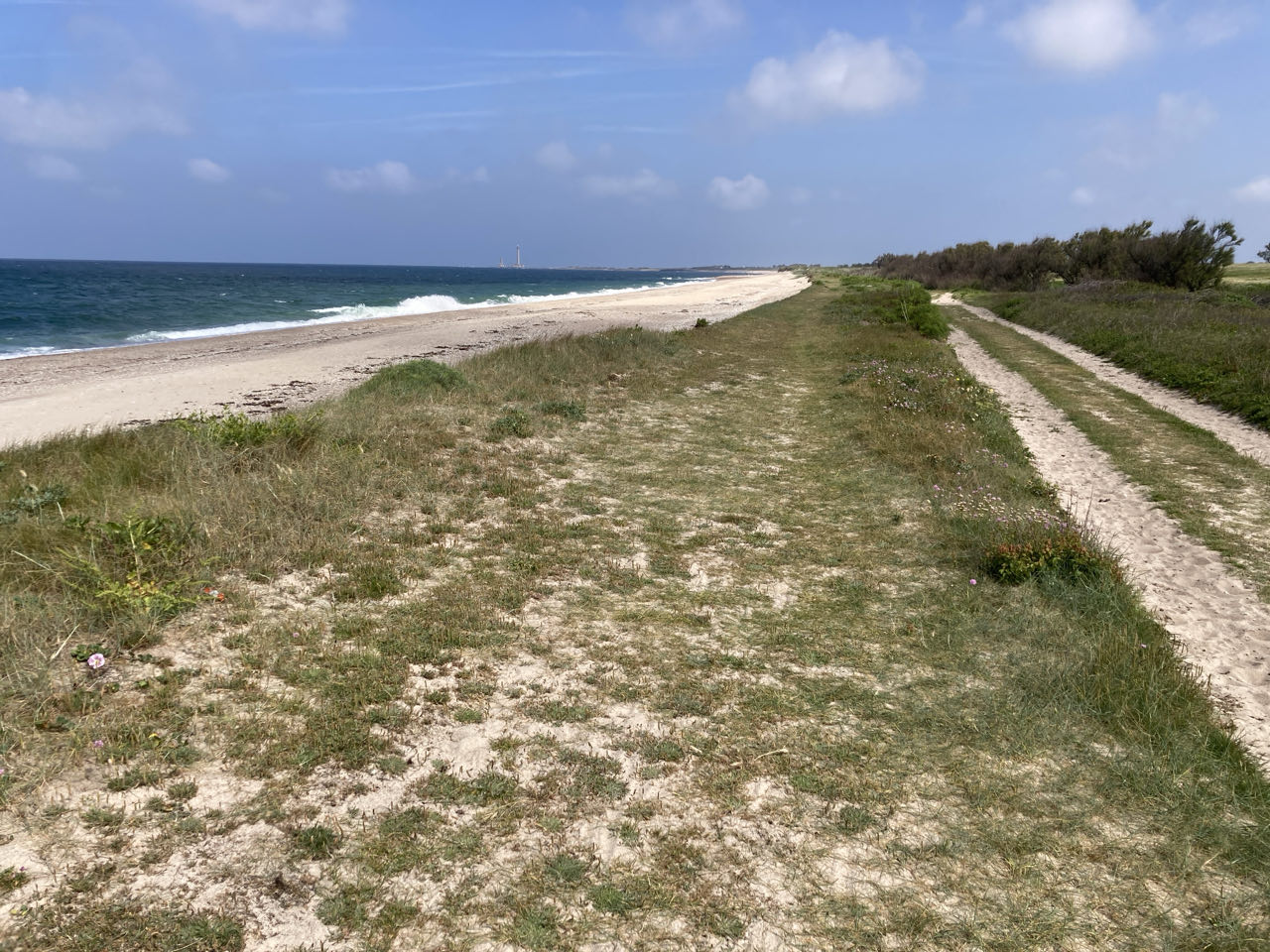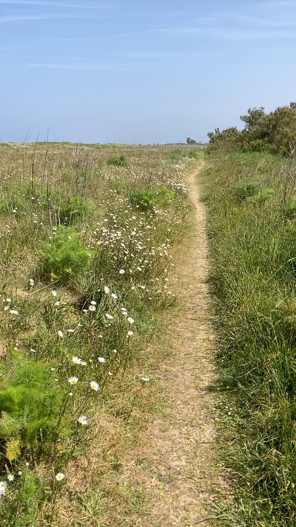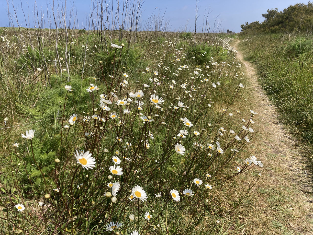 Derrière la plage, il y a des terres humides, des étendues d’eau avec des oiseaux. Plus loin, c’est un petit chemin entre les marguerites et le fenouil sauvage. Je casse une tige et me frotte les mains avec pour en respirer l’odeur.