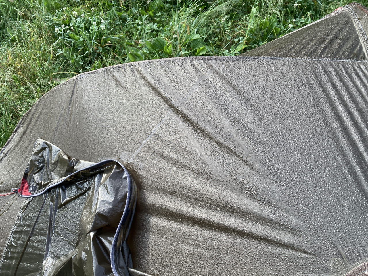 7h30. Tous les matins, le double toit de ma tente est détrempé. Je passe 20 minutes à l’essuyer entièrement avec ma lavette jaune. L’intérieur d’abord, pour éviter que les gouttent tombent sur la toile de la chambre, puis l’extérieur.