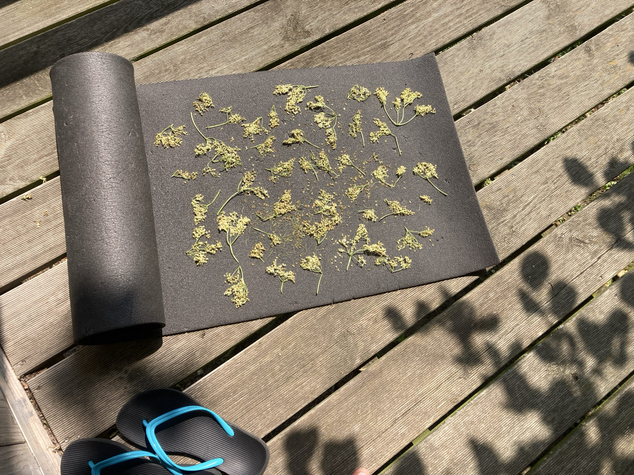 🛖 J’ai décidé de passer une nuit de plus dans la cabane. C’est un bon endroit pour me reposer. J’ai de la place à l’intérieur, une petite table, une terrasse extérieure, l’électricité, deux lits dont l’un me sert pour étaler mes affaires et faire sécher des fleurs de sureau.
