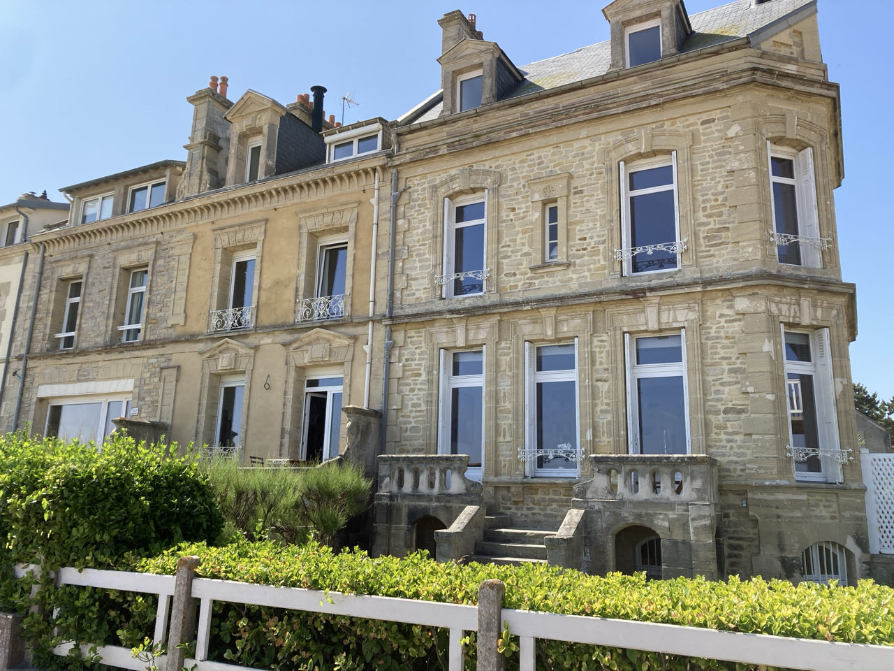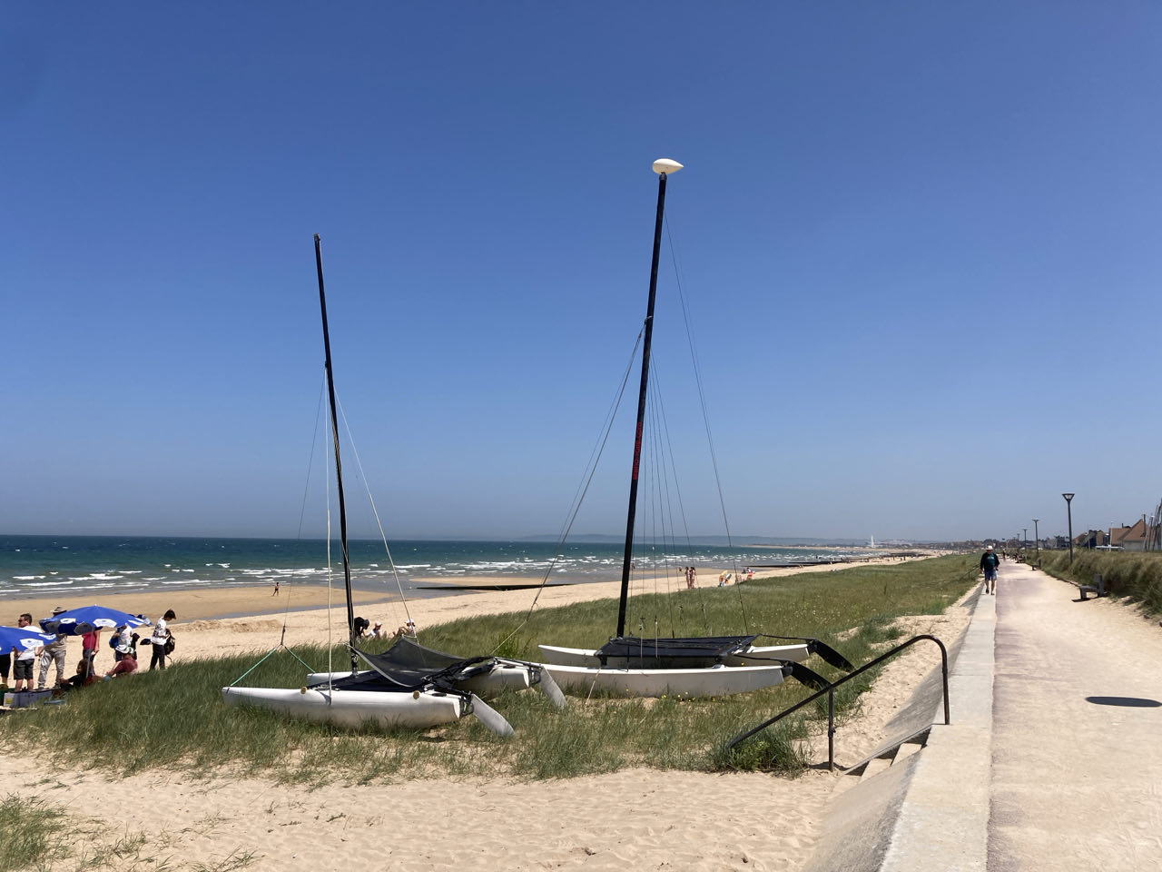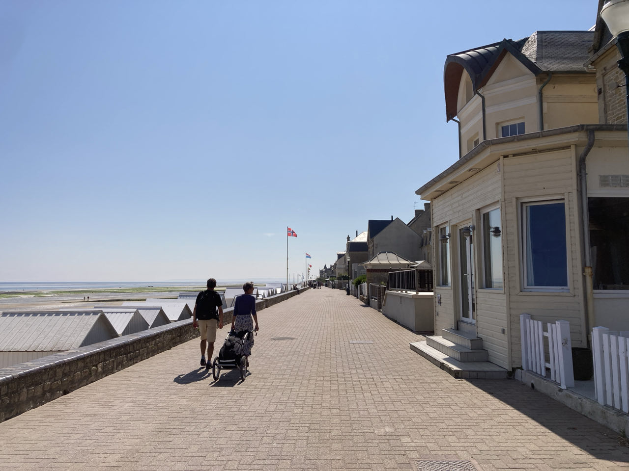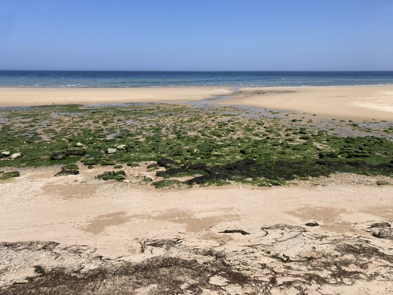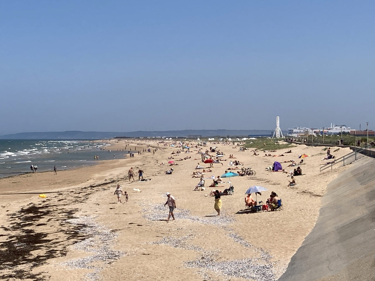 14h. Il fait chaud 🥵 On ne doit pas être loin des 30 degrés. J’avance toujours sur le front de mer. Le sol renvoie la chaleur, heureusement qu’il y a un petit vent. Pas d’ombre, nulle part. Je me protège la tête avec mon écharpe. Luc-sur-Mer, ambiance jeune et branchée. Lion-sur-mer avec des bâtisses énormes cossues au bord de la mer. Ouistreham, beaucoup de monde sur la plage. Vraiment, je ne comprends pas ce tourisme balnéaire.