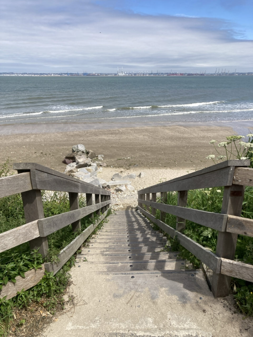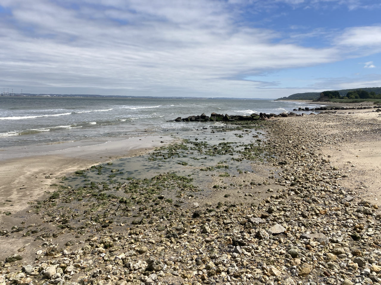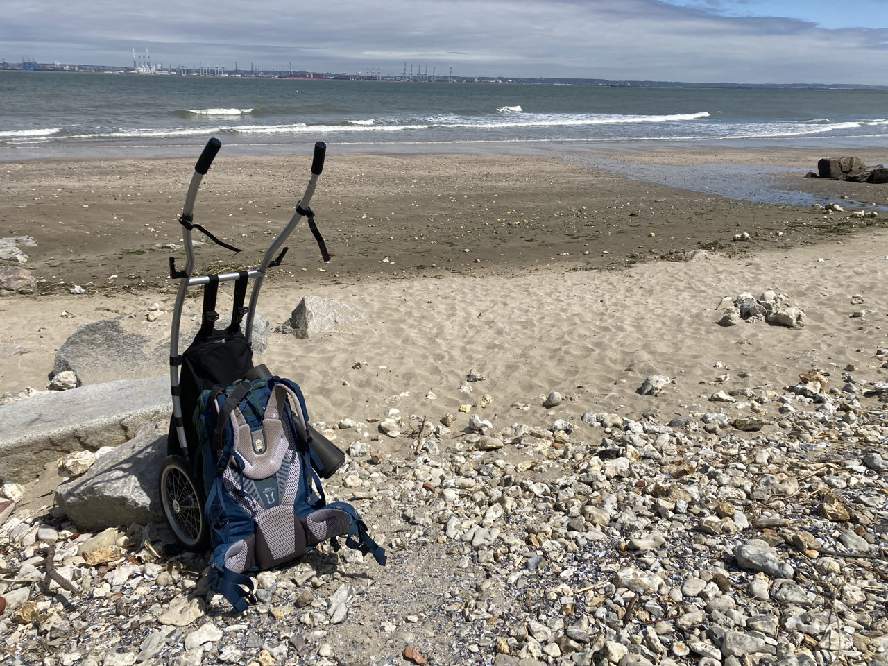 J’attends sur la plage de Criqueboeuf. La mer est encore trop haute pour que je passe les épis rocheux avec la chariotte !