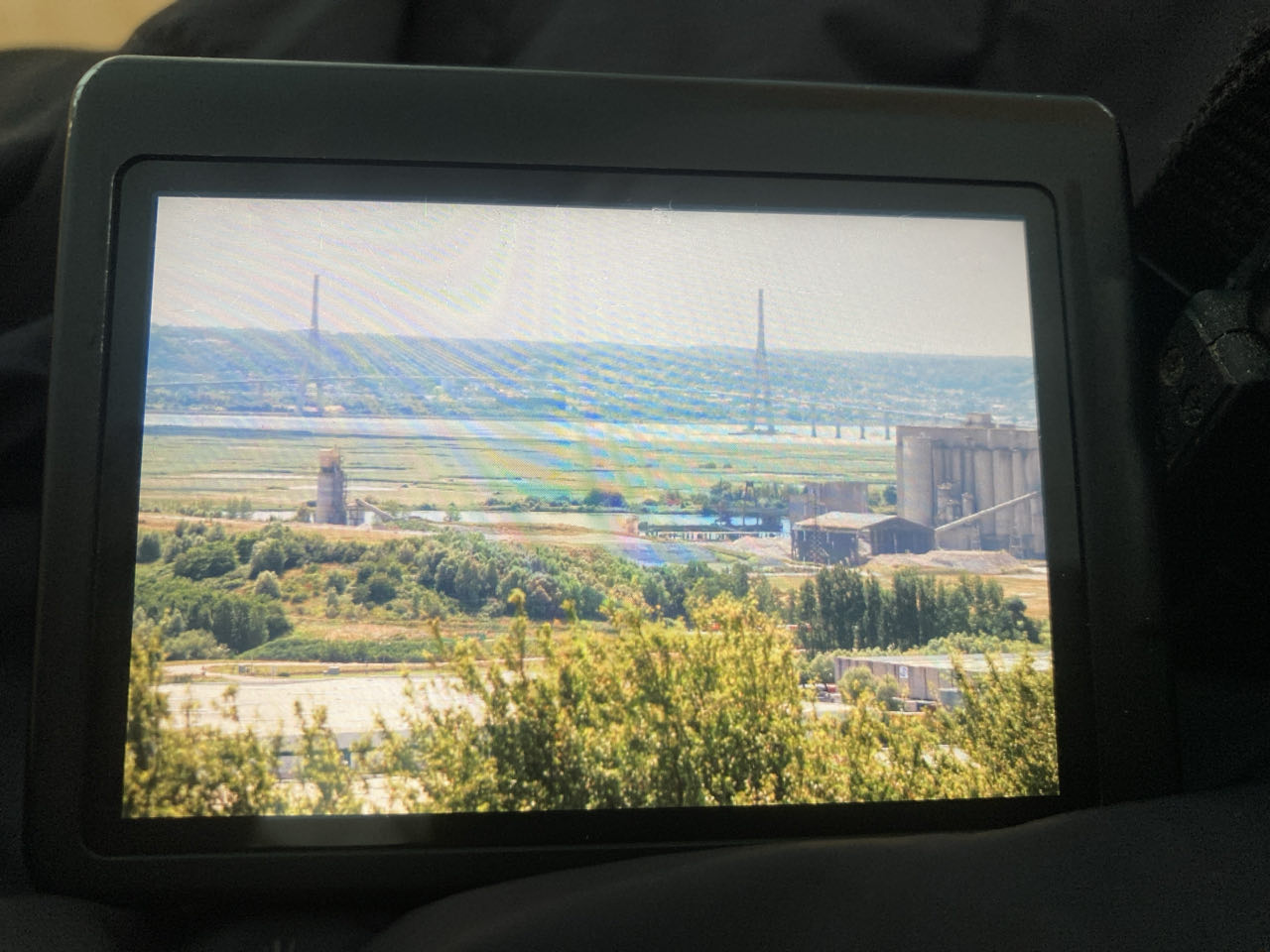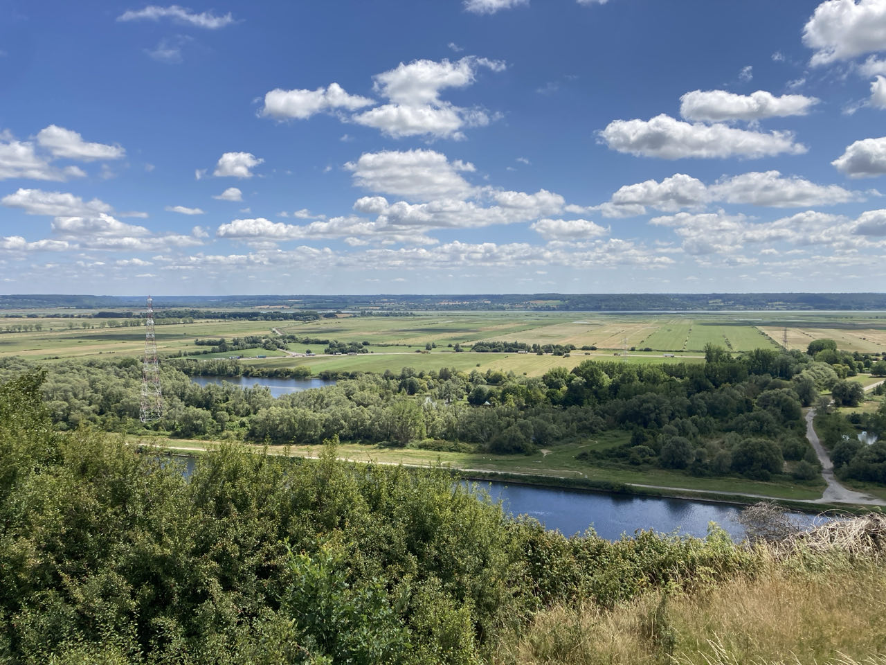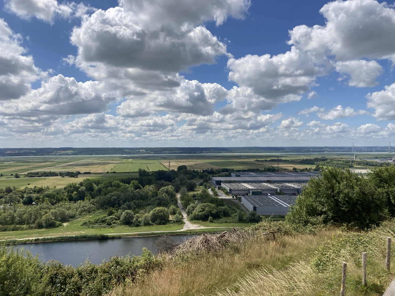 12h30. Je m’arrête 3h au point de vue du cap du Hode. Juste en dessous passe l’A131 que je ne vois pas mais que j’entends. Quel vacarme ! En face de moi, la zone industrielle, le canal du Havre à Tancarville, les marais et la Seine. Sur ma droite, le pont de Normandie avec ses haubans. Sur ma gauche, le pont rouge de Tancarville. J’ai encore changé d’avis et je vais le traverser finalement ! 🌉