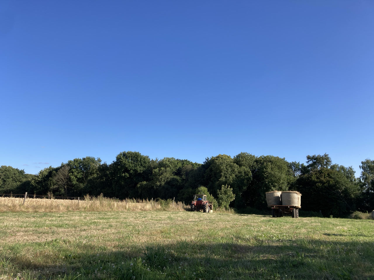 18h15. Un bruit de moteur approche sur le chemin. Deux vieux tracteurs arrivent dans ma direction et tournent dans le champ. 🚜 Le premier est conduit par un enfant d’une dizaine d’année à peine qui s’arrête en me voyant. Dans la cabine du second tracteur, un homme avec un tee-shirt bleu ne semble pas du tout gené par ma présence. Je vais à sa rencontre pour lui demander si je peux rester là cette nuit. « Pas de problème, tant que vous laissez propre. Je viens juste chercher mon foin. »