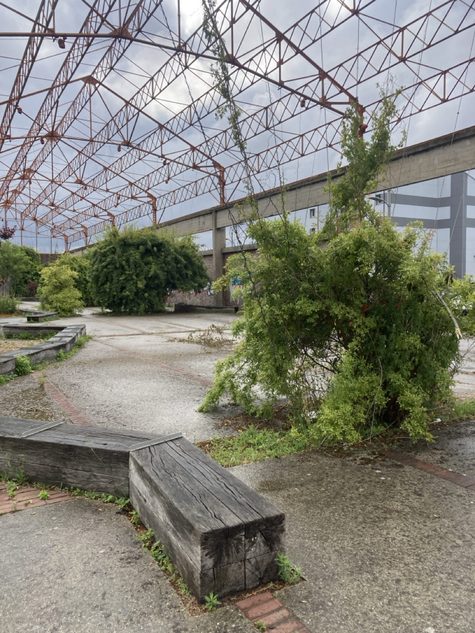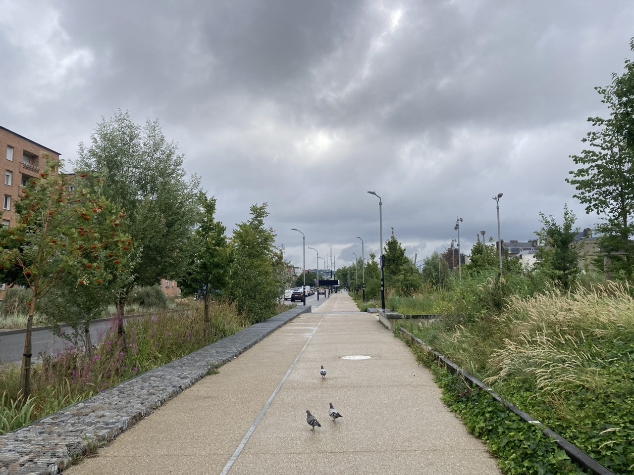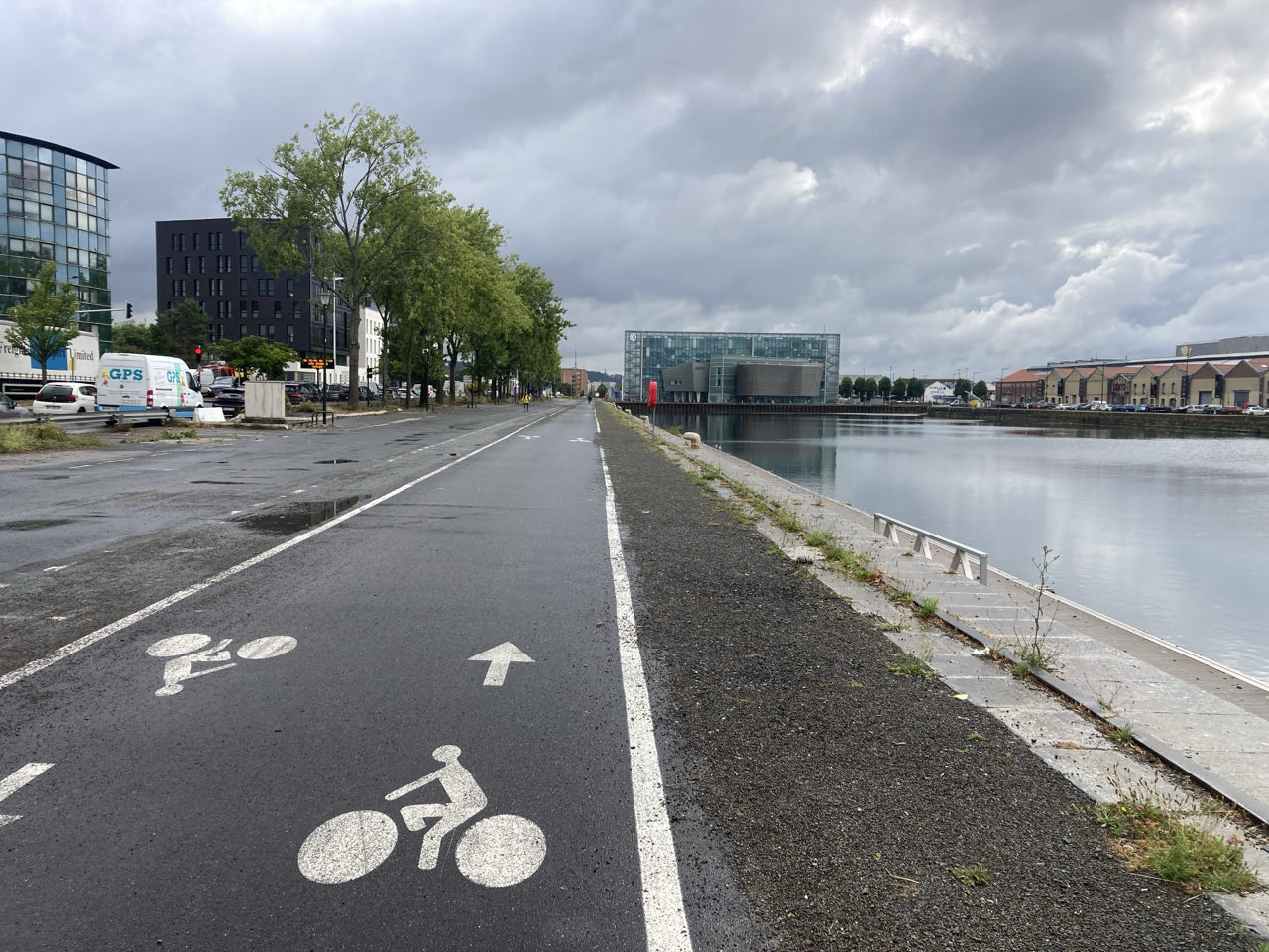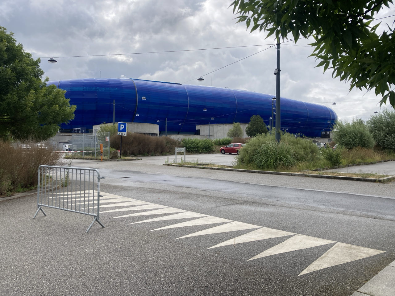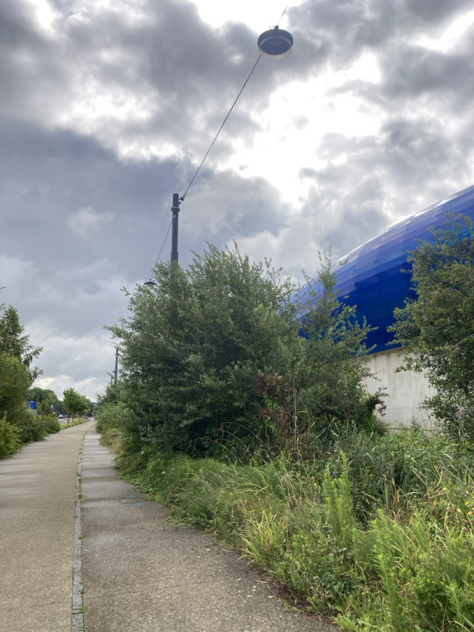 9h30. Je glisse la clé du logement dans la boîte aux lettres. Il fait gris. J’ai décidé de suivre une piste cyclable pour sortir rapidement du Havre. Le GR tournicote dans tous les sens sur les hauteurs de la ville et je n’ai pas envie de faire du dénivelé avec Rouletab qui est bien chargée. Je passe devant des bâtiments industriels réaménagés, je trouve ça sympa. Puis, le stade Océane avec son revêtement bleu.