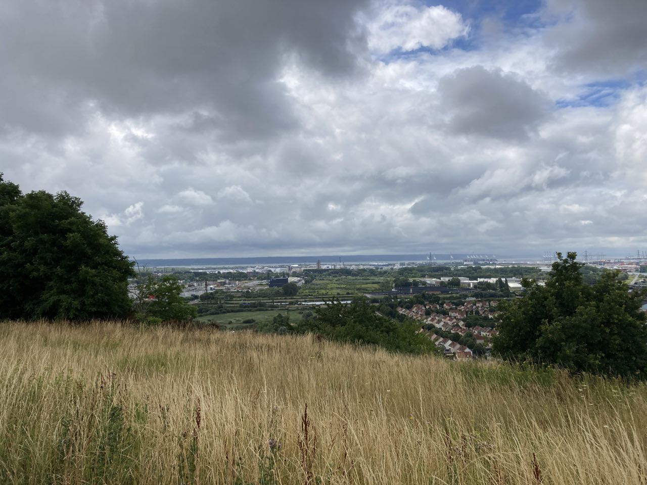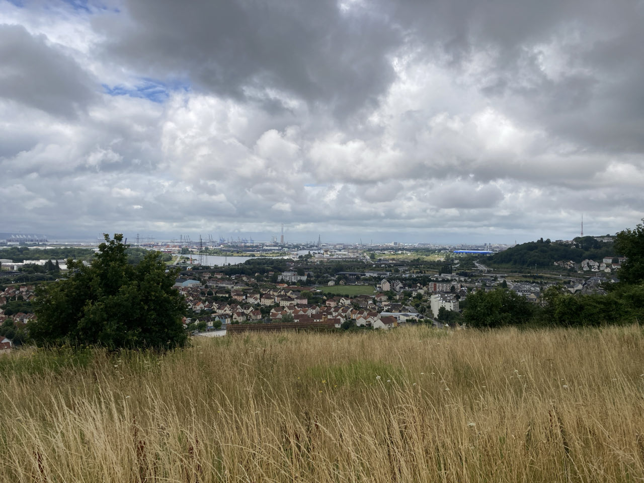 12h30. Ça grimpe dans la forêt vers Gonfreville-l’Orcher. En haut, un impressionnant panorama sur le port du Havre et la raffinerie. Ça ne rend pas très bien avec le téléphone… Les photos prises avec mon reflex sont mieux mais je ne peux pas les transférer. 😅