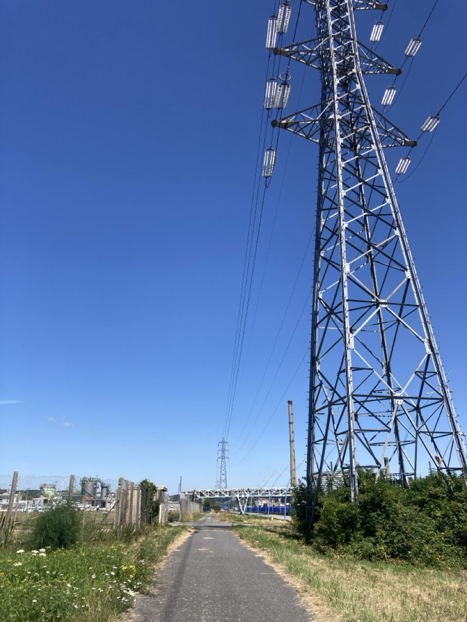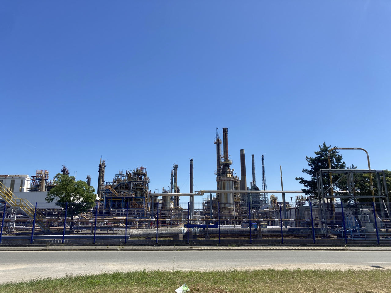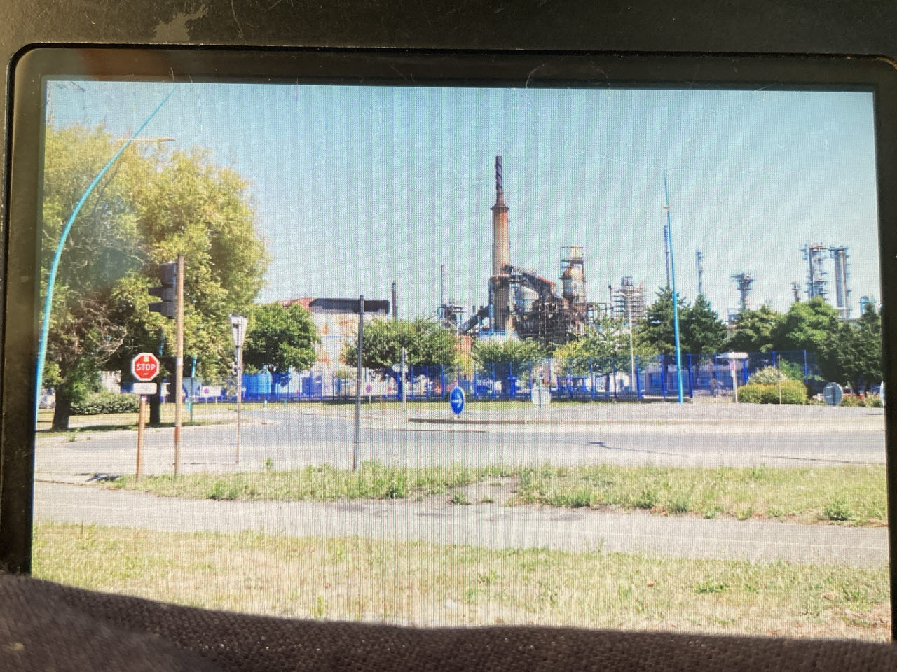 15h. 🏭 Je suis en plein milieu de la raffinerie. La piste cyclable est déserte. Des voitures roulent à côté. Sinon, personne. Il fait chaud. Le décor est surréaliste. Des tuyaux de toutes les tailles s’entremêlent partout. Des cheminées se dressent de tous les côtés. Parfois une flamme. Ça pue. Odeur d’essence. C’est bruyant. De la fumée s’échappe des tuyaux. On dirait que tout est sous pression. Des cuves rouillés. Des passerelles peintes en jaune. Ou en bleu. Des grillages. On dirait un décor de film.