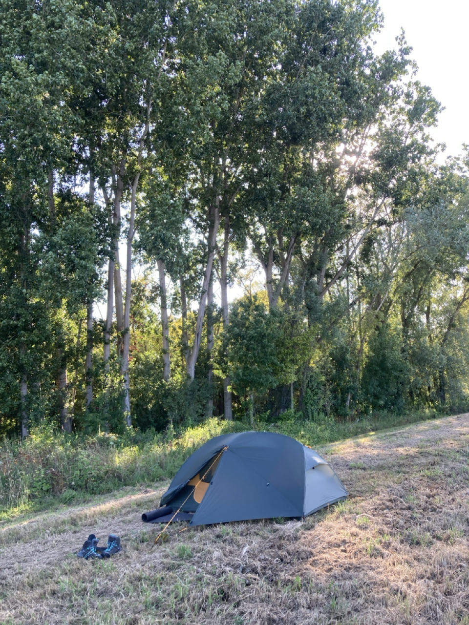 18h30. ⛺️ Je pensais bivouaquer au bord de la Seine mais j’ai trouvé un coin pas mal avant. Je m’arrête, car je ne suis pas sûre de trouver mieux plus loin. Je suis un peu déçue de ne pas dormir près de l’eau mais je suis consolée par la présence de peupliers. J’adore le bruit des feuilles dans le vent. 🍃 En mangeant, je détaille les nuances de couleurs des arbres, les saules plus claires, presque blanchâtres, tranchent avec le vert sombre des peupliers. Ce ne sont que des arbres qui aiment l’eau, la Seine n’est vraiment pas loin.