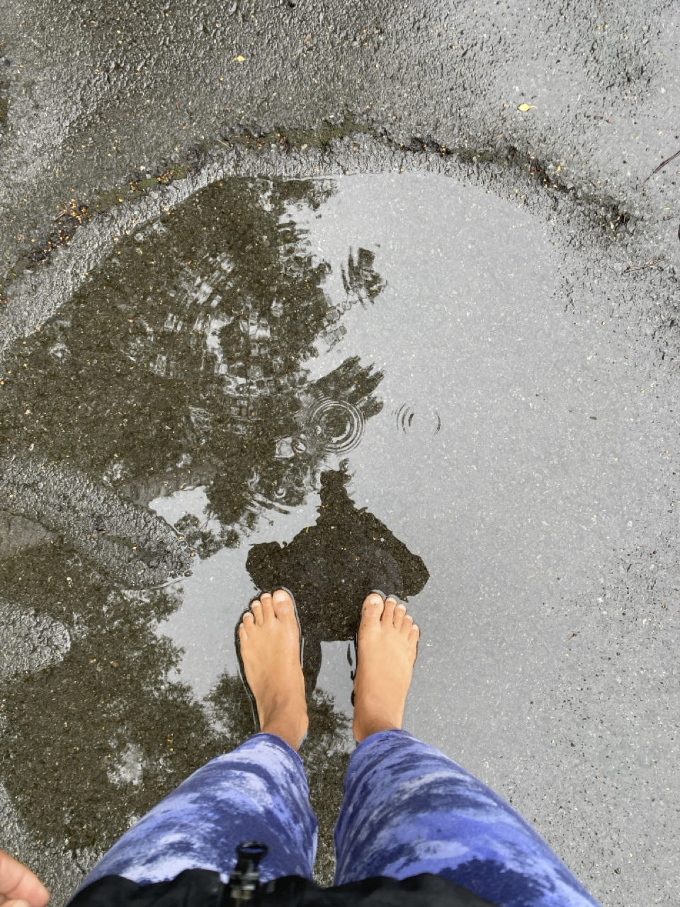 Alors, sur la piste cyclable mouillée, j’ai pris mes chaussures à la main. Le bitume était tiède, les flaques d’eau aussi. Le sol rejetait la chaleur accumulée de ces derniers jours. Je sentais toutes les aspérités du sol sans avoir mal aux pieds. C’était agréable. Je me sentais bien.