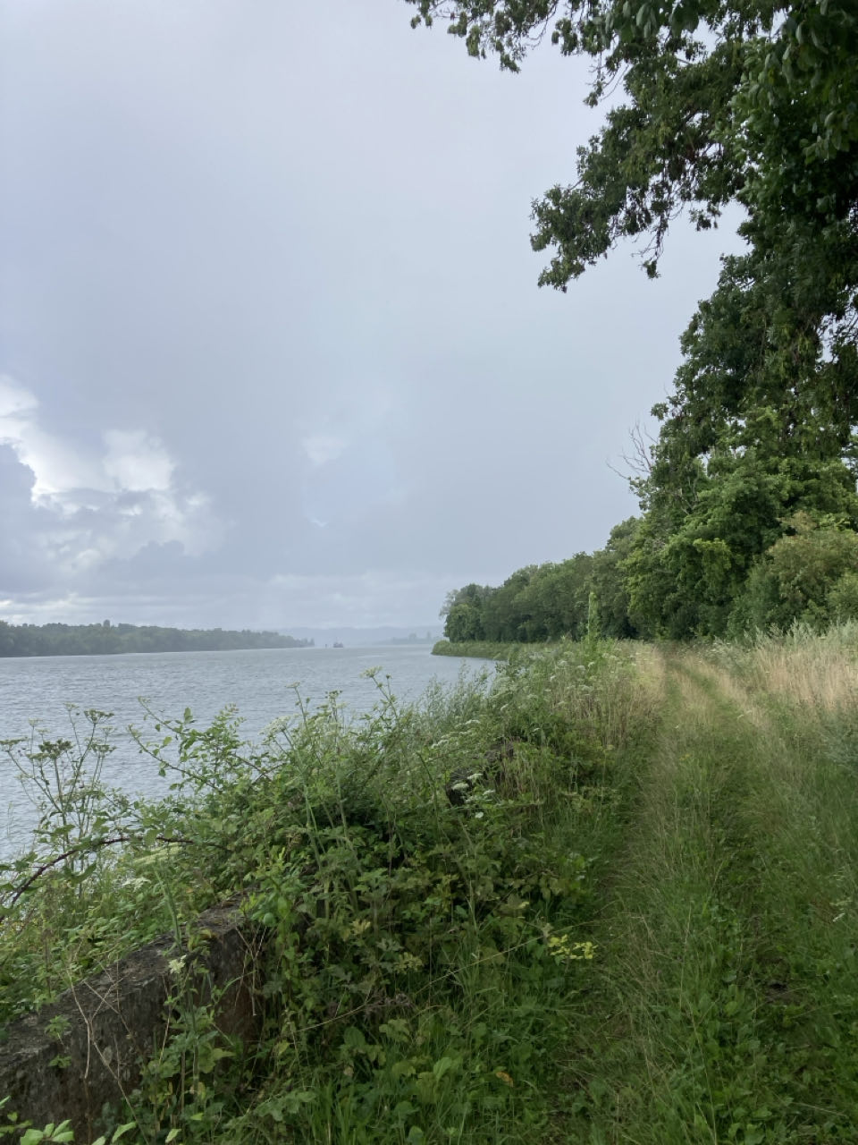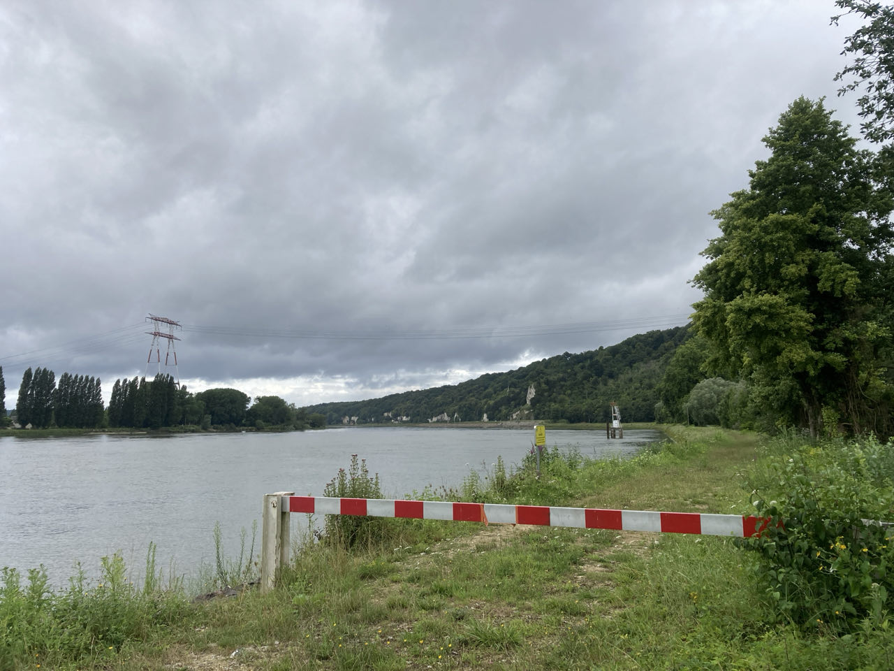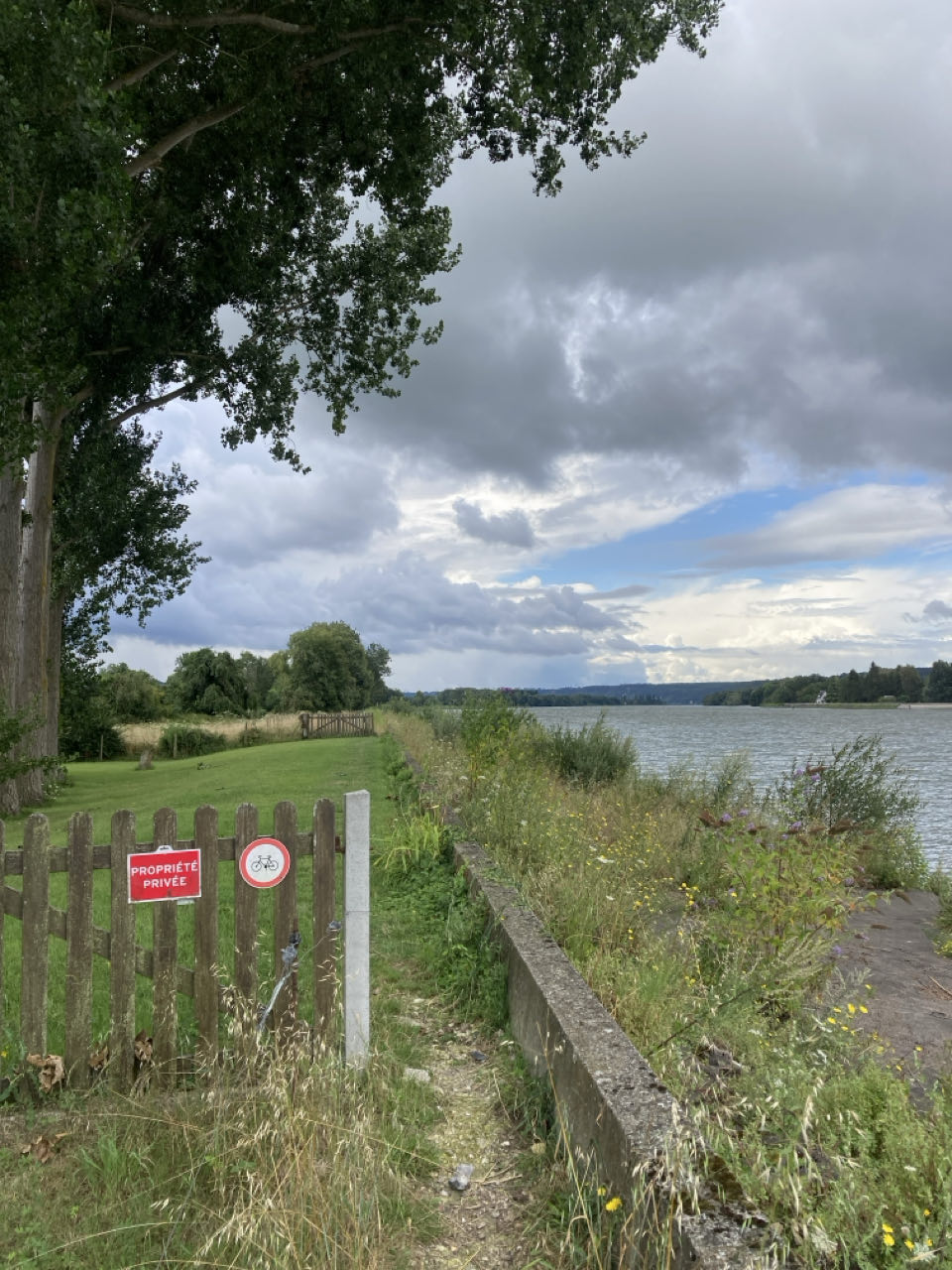 Je récupère rapidement le chemin de halage qui est désert. Dans un virage, un épagneul et deux chihuahuas surgissent. 🐕🐕🐕 Le premier est calme et m’ignore mais les deux petits aboient et l’un d’eux me pince le mollet et tire ma chaussette ! Un monsieur arrive en courant et s’excuse platement. Pendant ce temps, le chien m’attrape l’autre mollet 😳 Le monsieur est super gêné et je me remets en route rapidement.