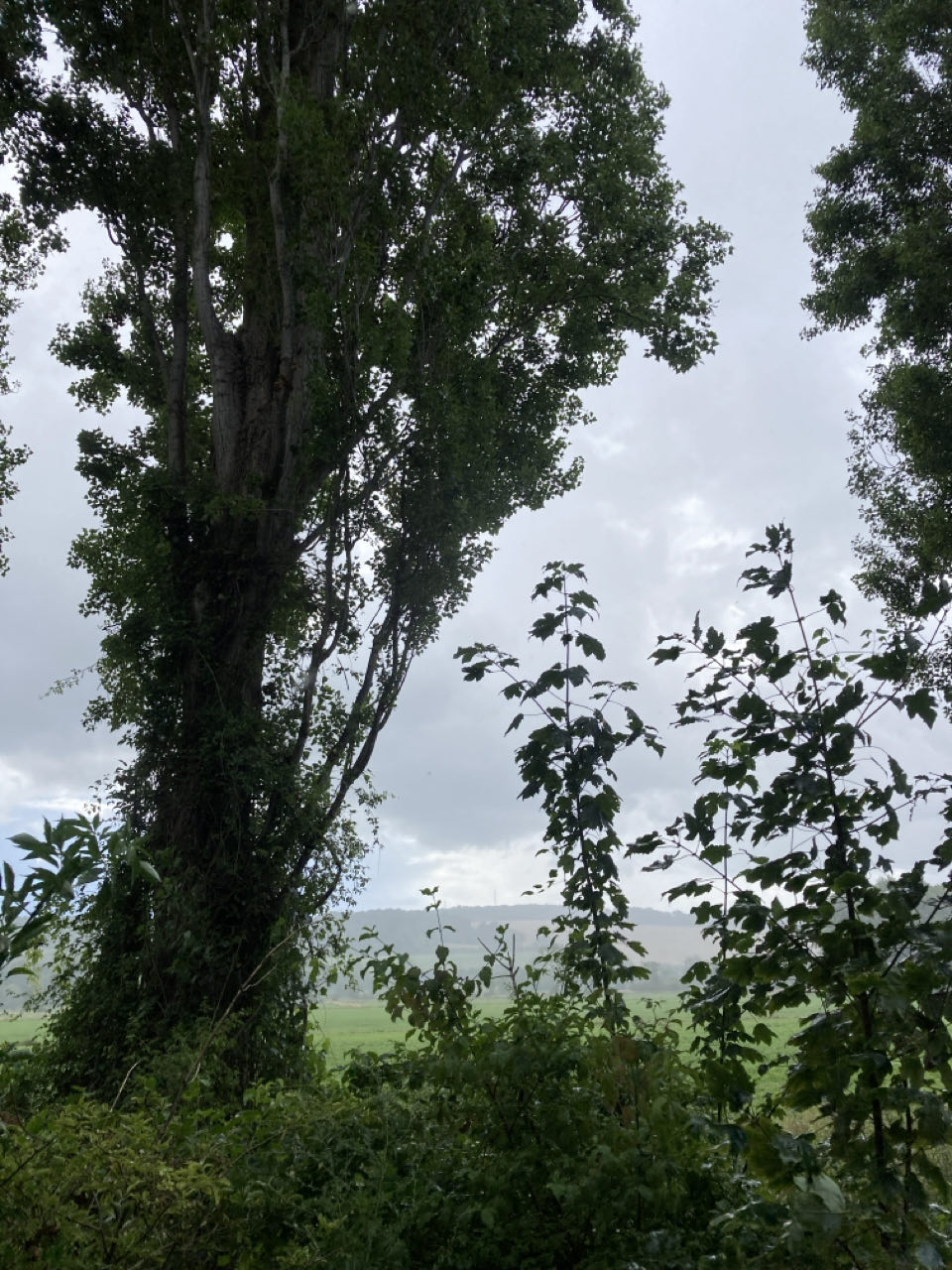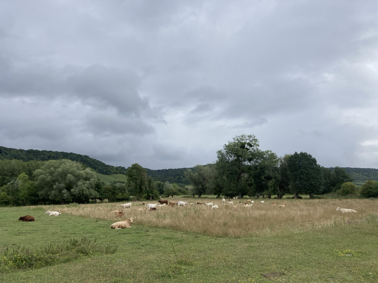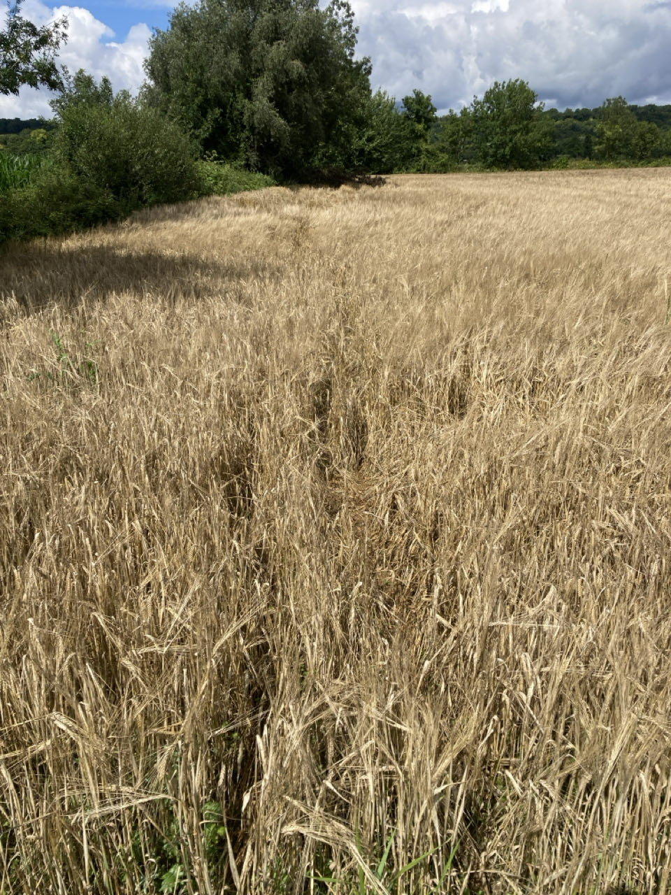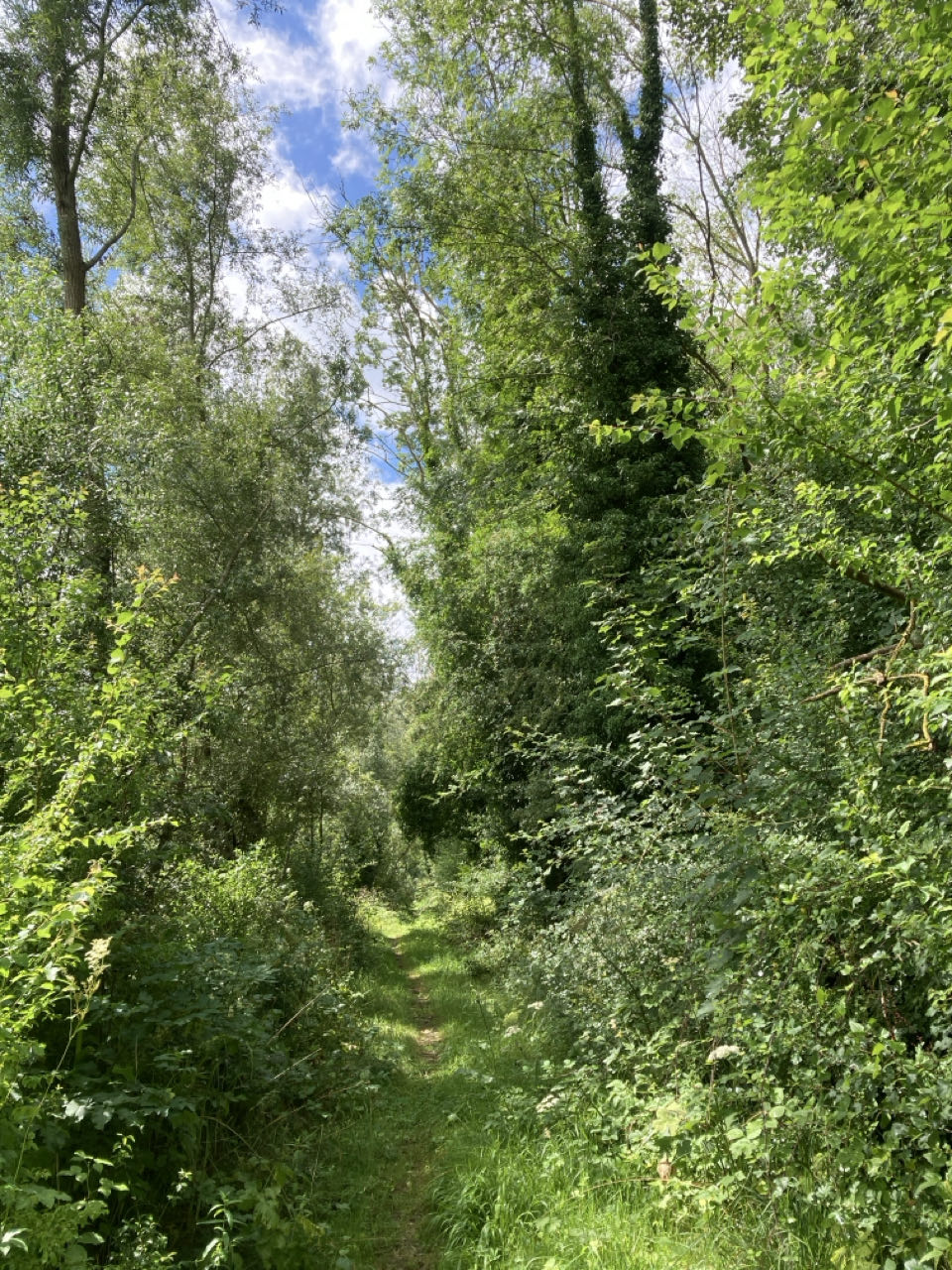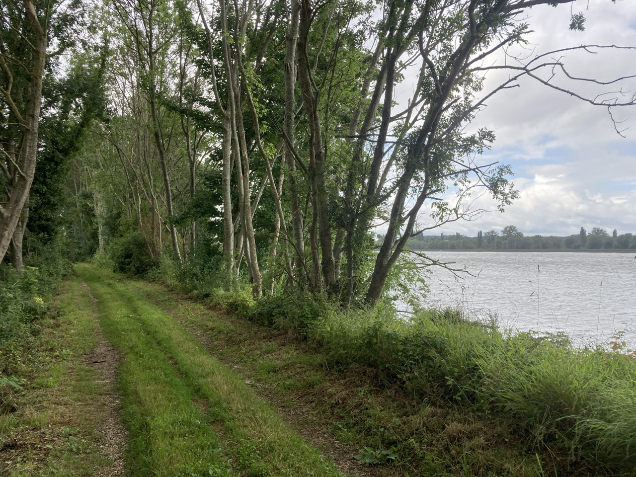 12h40. Le chemin de halage traverse des jardins. De grandes maisons semblent se cacher derrière les arbres. 🏡 Plus loin, j’emprunte une sente d’animaux dans un champ. L’avantage de Rouletab c’est qu’elle n’écrase rien !