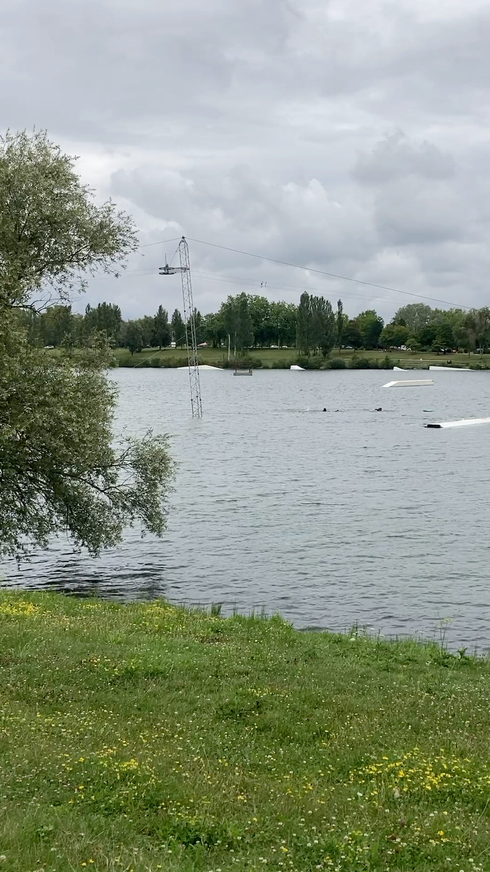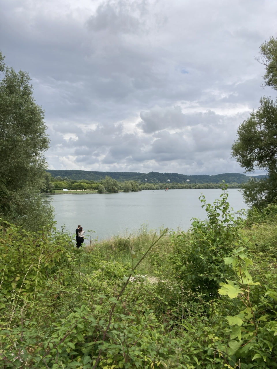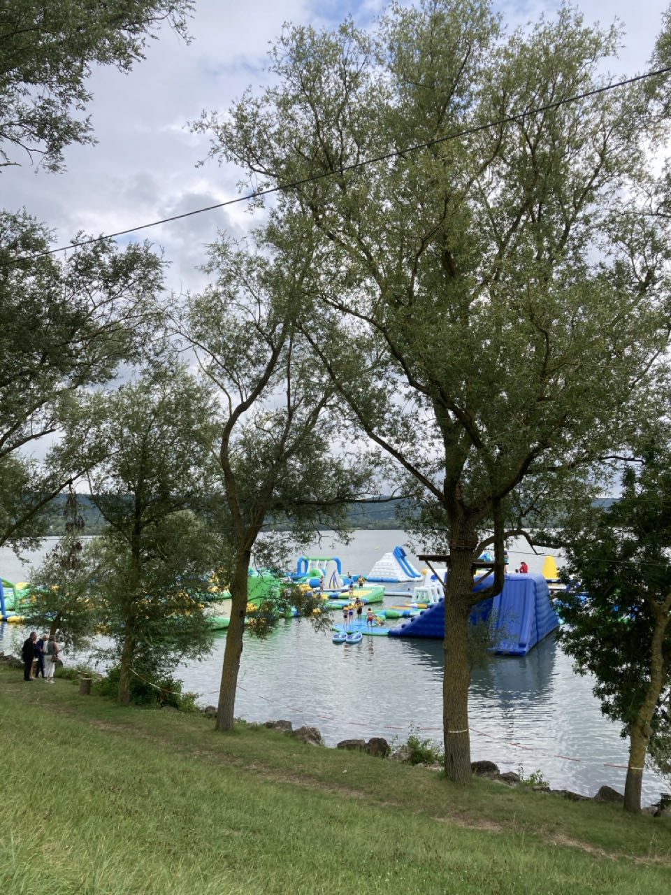 15h. Départ ! Je longe le lac de la base de loisirs de Léry-Poses. Téléski nautique, structures gonflables dans l’eau, accrobranche, golf, zone de baignade. Des familles, des groupes, des barbecues, de la musique.