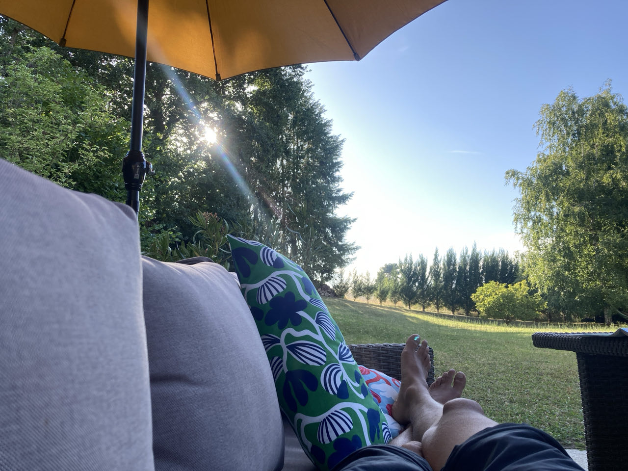 🏡 Je suis maintenant chez Aline ! Vous vous souvenez d’elle ? Je l’ai croisée à plusieurs reprises dans la Manche, elle marchait avec son gros sac à dos (jours 47, 48 et 58). Sa maman, Louise, est là aussi. C’est chouette d’être chez Aline, de manger sur la terrasse, de m’allonger sous les parasols. On a beaucoup discuté, parlé de nos expériences.