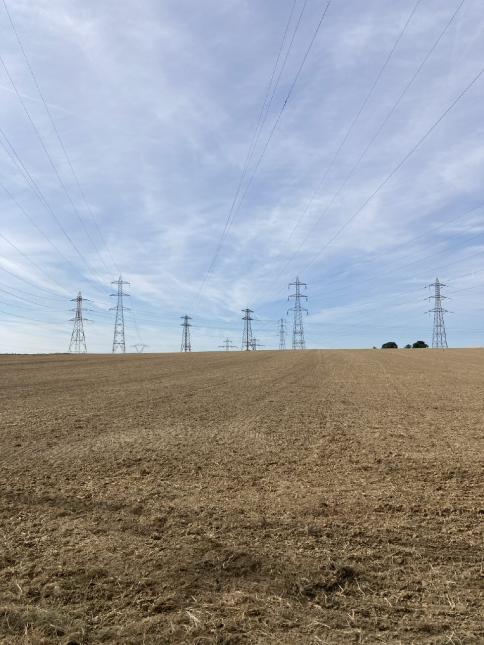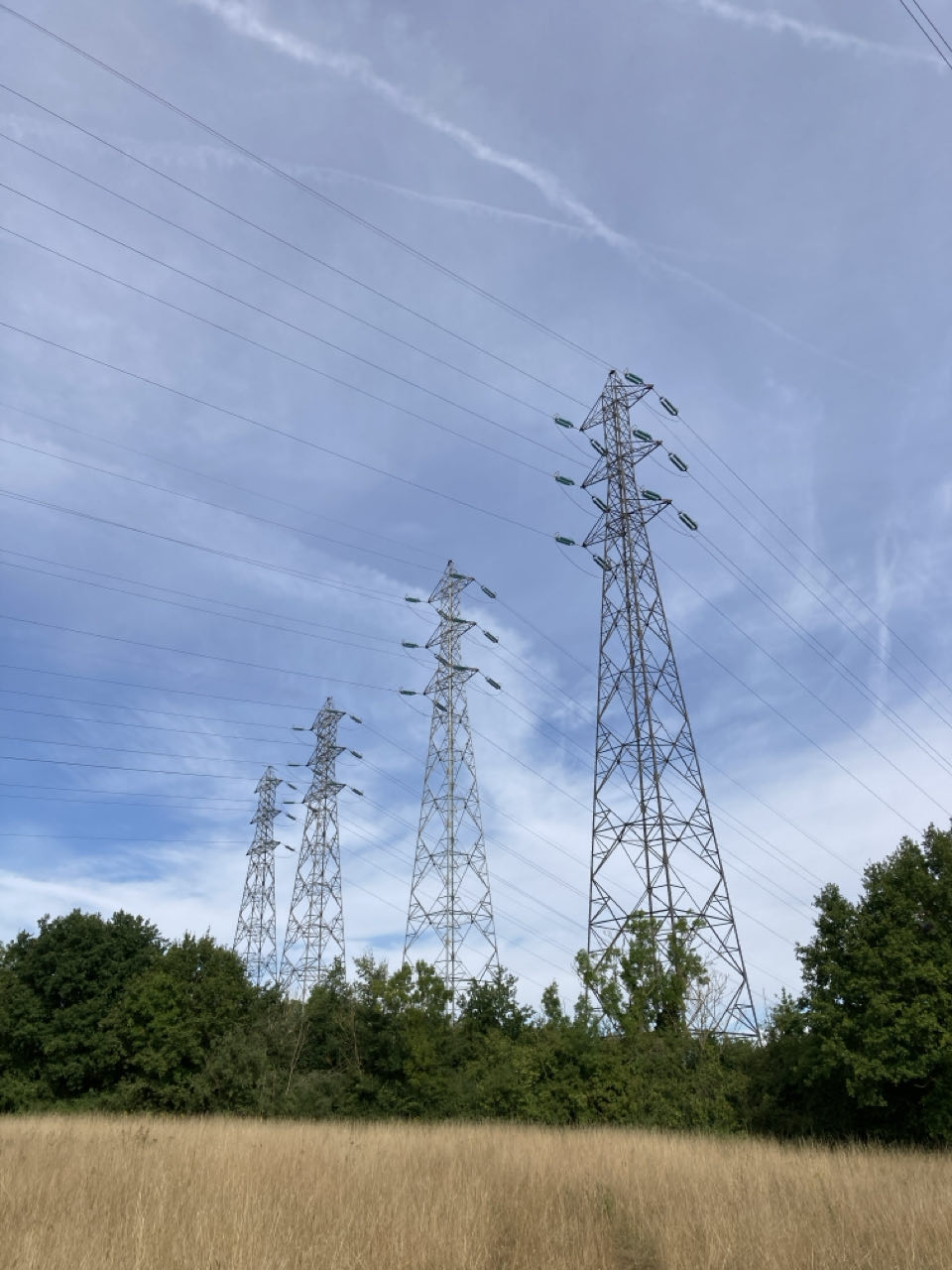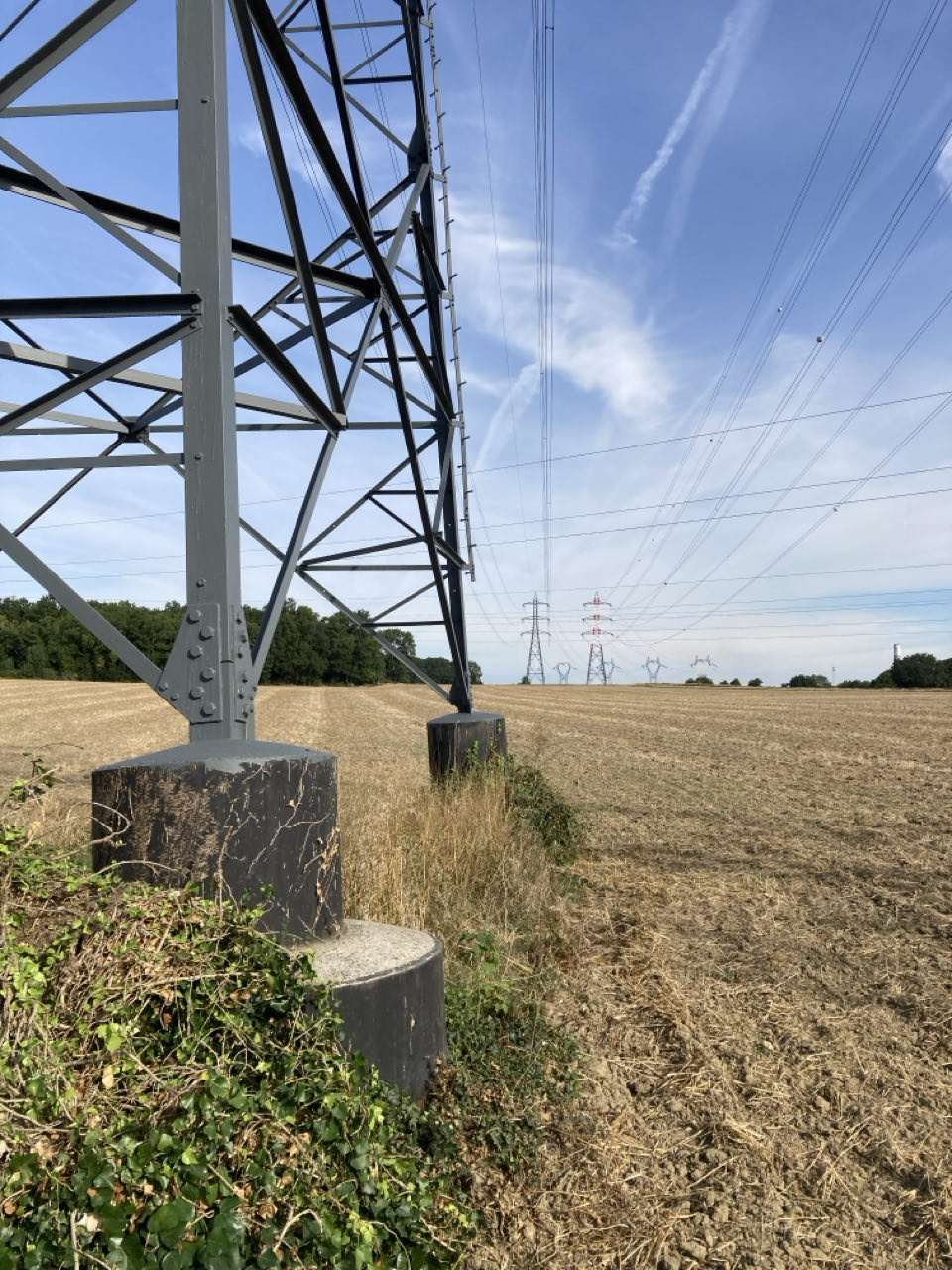 Ça n’a rien d’époustouflant, mais ça m’étonne à chaque fois. Toutes ces installations démesurées qui traversent la campagne. Ces lignes là sortent de la centrale électrique de Porcheville au bord de la Seine.