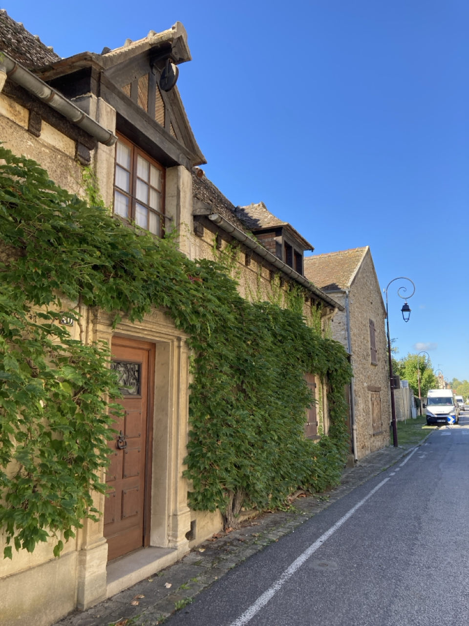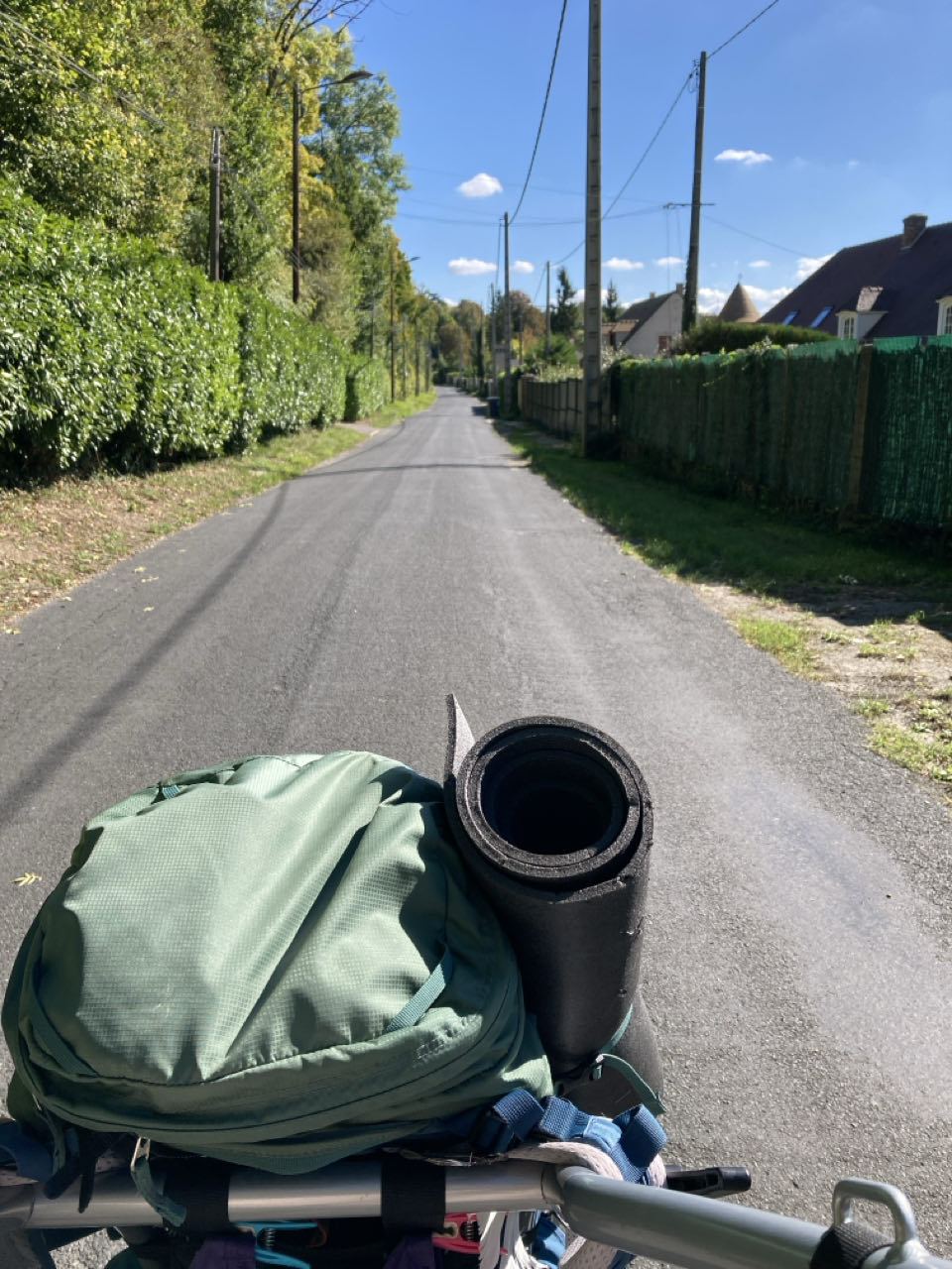 Morsang-sur-Seine. La route est peu passante. C’est agréable. J’avance sans difficulté et j’en profite pour me reposer le dos en accrochant mon sac sur Rouletab. C’est riche, très riche. Les bords de Seine sont privés, accaparés par d’immenses jardins bien tondus. Des maisons d’architecte, des maisons en bois, des grilles hautes, des portails automatiques et même des chaînes ! 😵 Vous savez, parfois il y a des énormes chaînes entre deux bornes devant les entrées des maisons, et bien cette chaîne la s’abaissait automatiquement en même temps que l’ouverture du portail ! Première fois de ma vie que je vois ça.