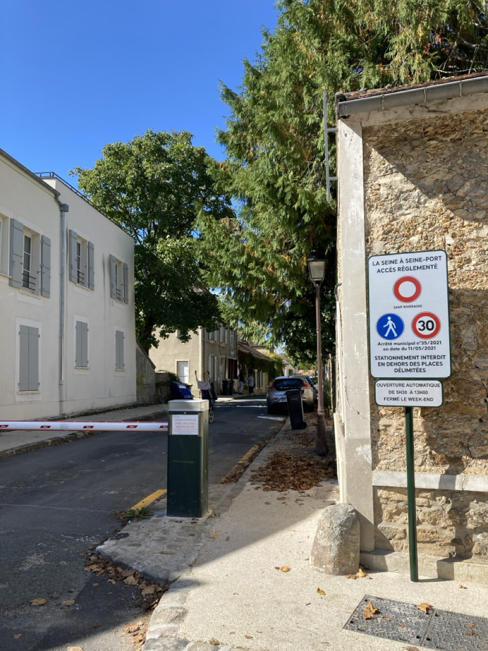 Port-Seine. Ambiance village. Des hommes jouent aux boules sur la place à l’ombre des tilleuls. À côté, un « bar à champagne et bistrot ». Je retrouve la Seine en passant par une rue où la circulation est réglementée. Je suis déjà passée par là l’année dernière avec une rando semelles et gamelles !