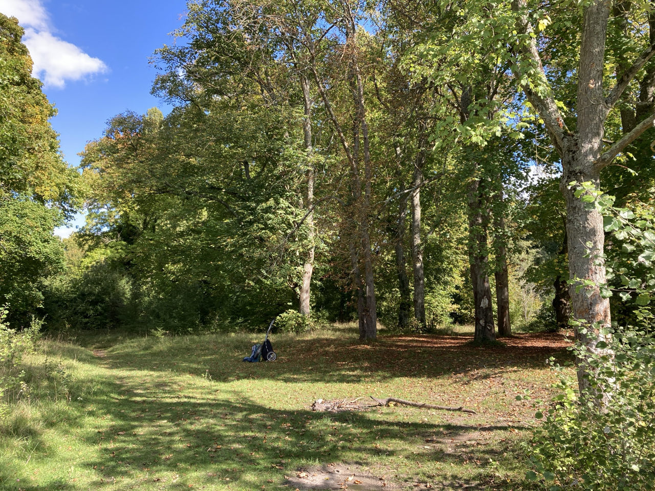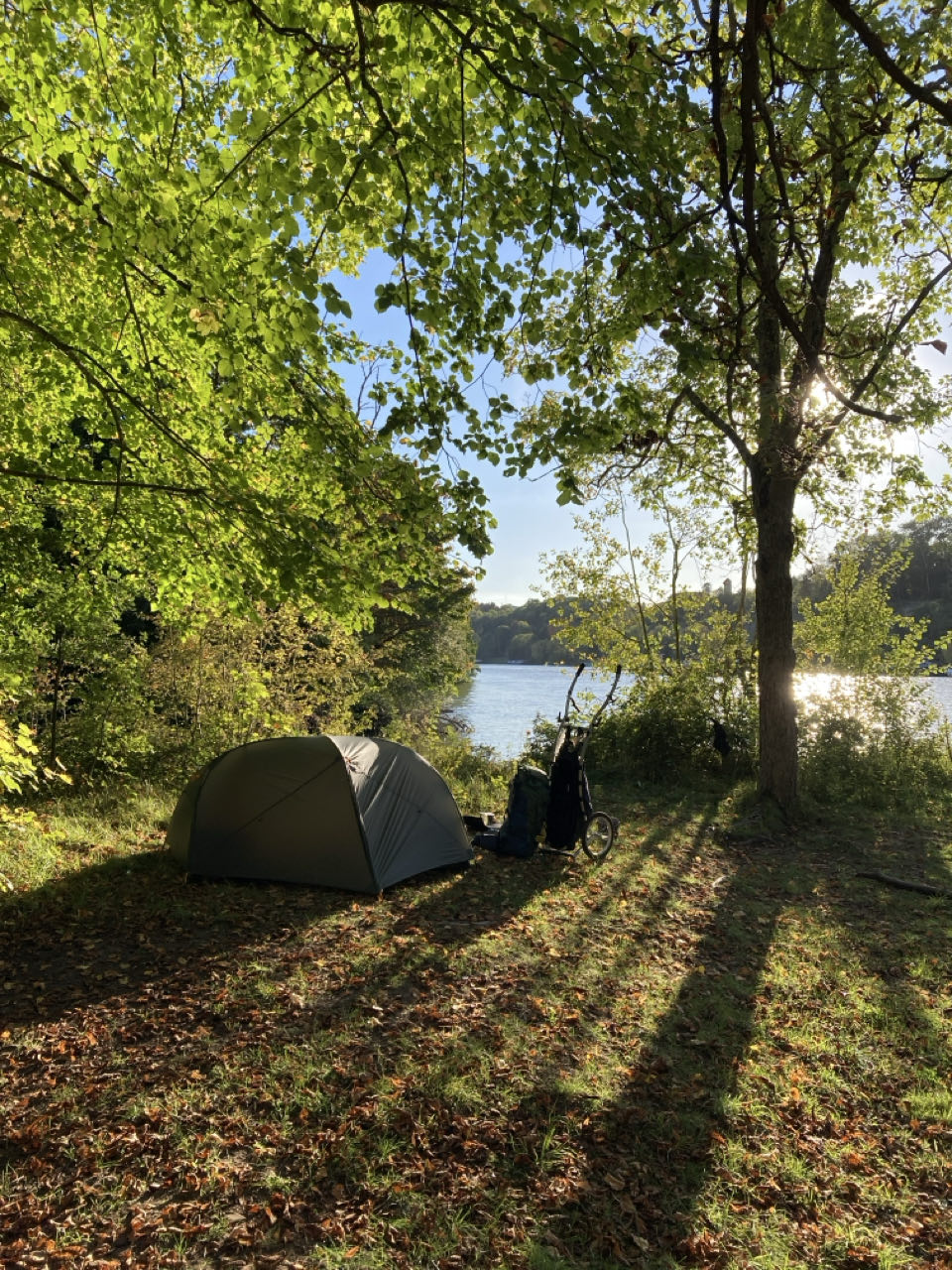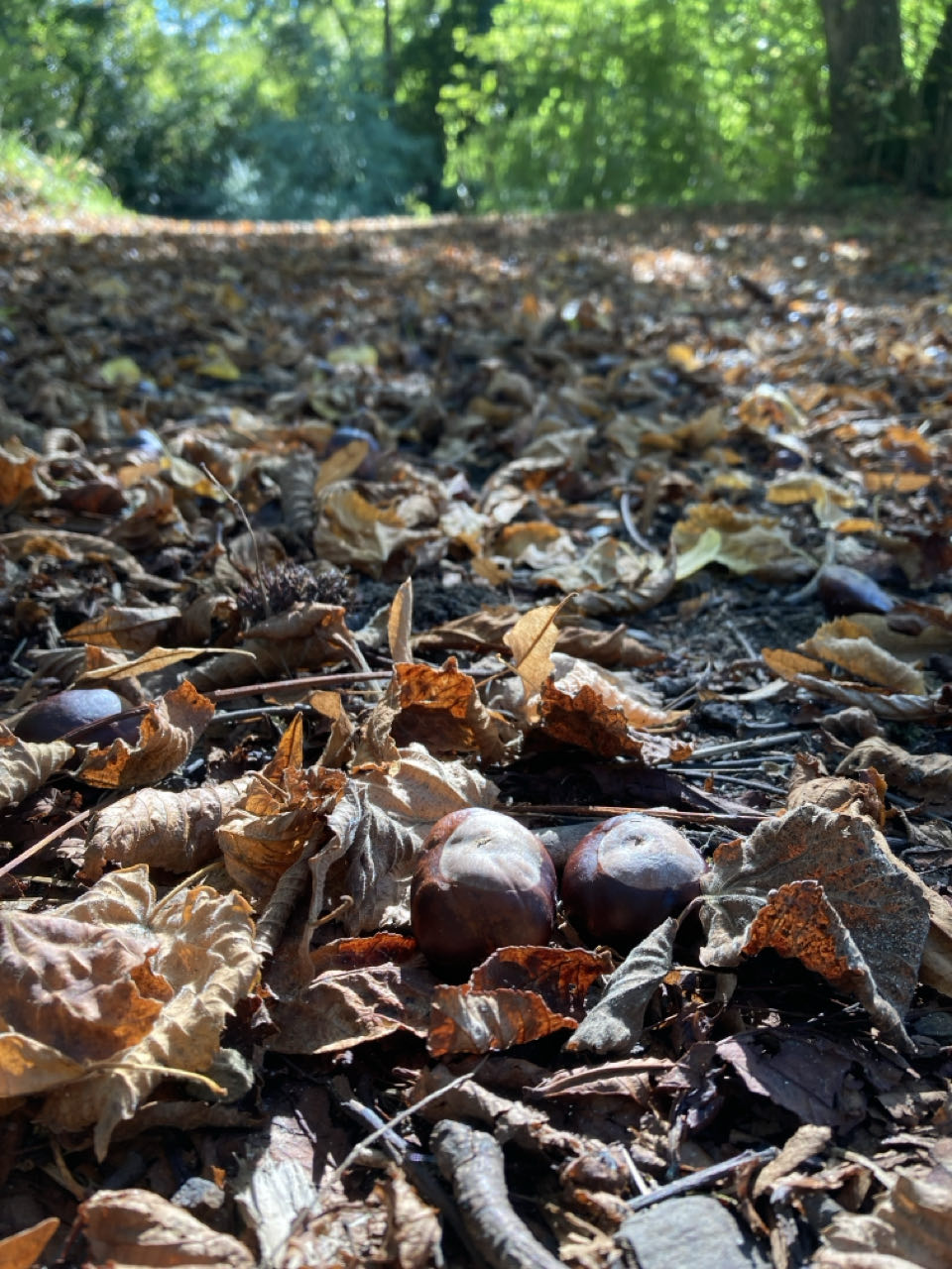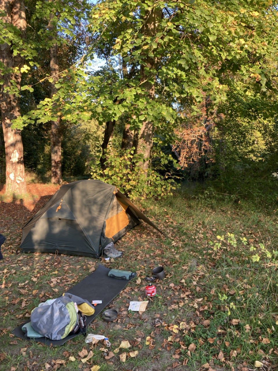 Toutes les feuilles des marronniers sont sèches et j’entends les marrons tomber bruyamment. Je m’installe plus loin, je n’ai pas envie qu’une bogue perce ma toile de tente en tombant !