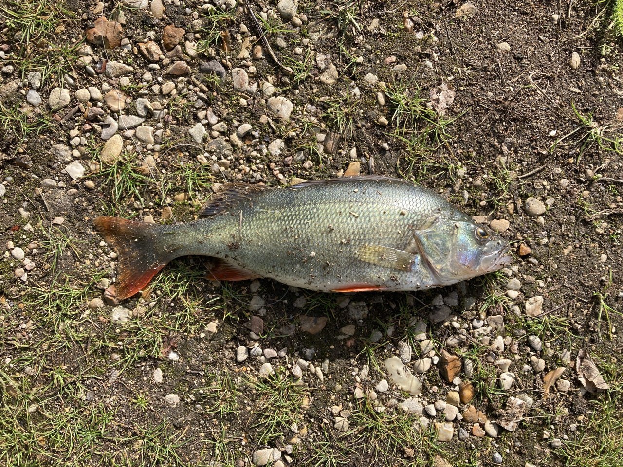 Après un pont, un poisson au soleil. 🥵 🐟Personne autour, bizarre. Il est superbe avec des écailles irisées et des nageoires rouges. Je prends une photo et il se met à frétiller. Il est vivant ! Mais qui laisse mourrir un poisson comme ça en plein soleil ?! 😡 Les poissons ressentent la douleur, de nombreuses études s’accordent à le dire.