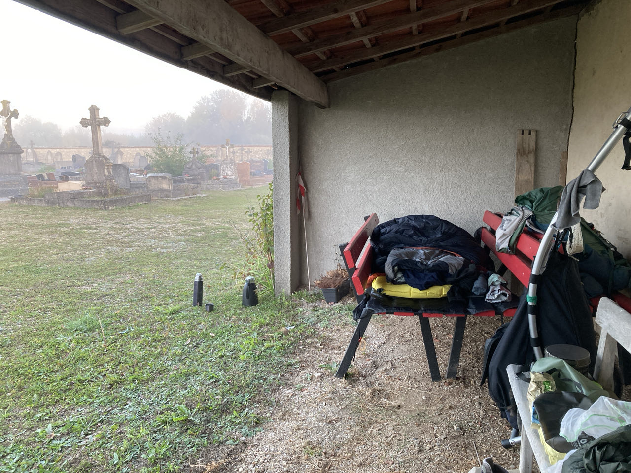🪦 J’ai dormi ici. C’est la première fois que je m’installe dans un cimetière. Je n’avais jamais osé avant. Moi, je n’y voyais pas d’inconvénient mais j’ai toujours eu peur du regard des gens, qu’on me trouve irrespectueuse. Mais cette fois-ci, l’opportunité était parfaite et j’ai tenté avec les encouragements de Clarisse. J’ai placé 2 bancs face à face pour me faire un lit.