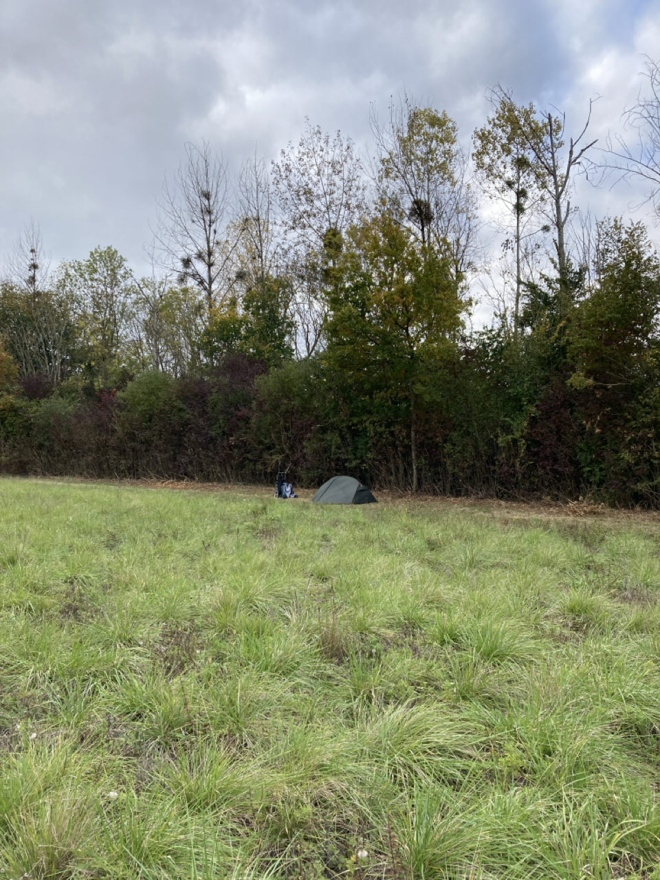 Je suis dans la campagne, journée très calme. Absolument personne sur les chemins. Quelques voitures au loin et des tracteurs dans les champs. J’ai interagi physiquement avec 3 personnes seulement : Marie au cimetière ce matin, Sylvain à la carrière, et Stéphanie avec son cheval Vuitton avant de planter ma tente.