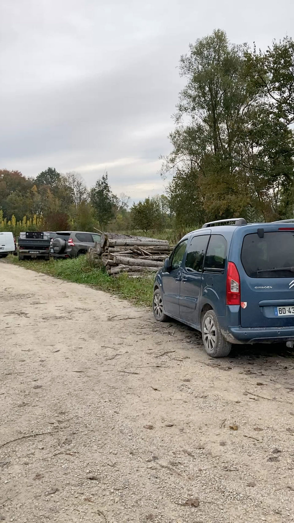 🐕 14h. Un 4x4 passe et se gare. Un homme en sort, crie après son chien de rester près de lui. L’homme enfile un gilet jaune, sort un fusil de sa voiture et s’éloigne.