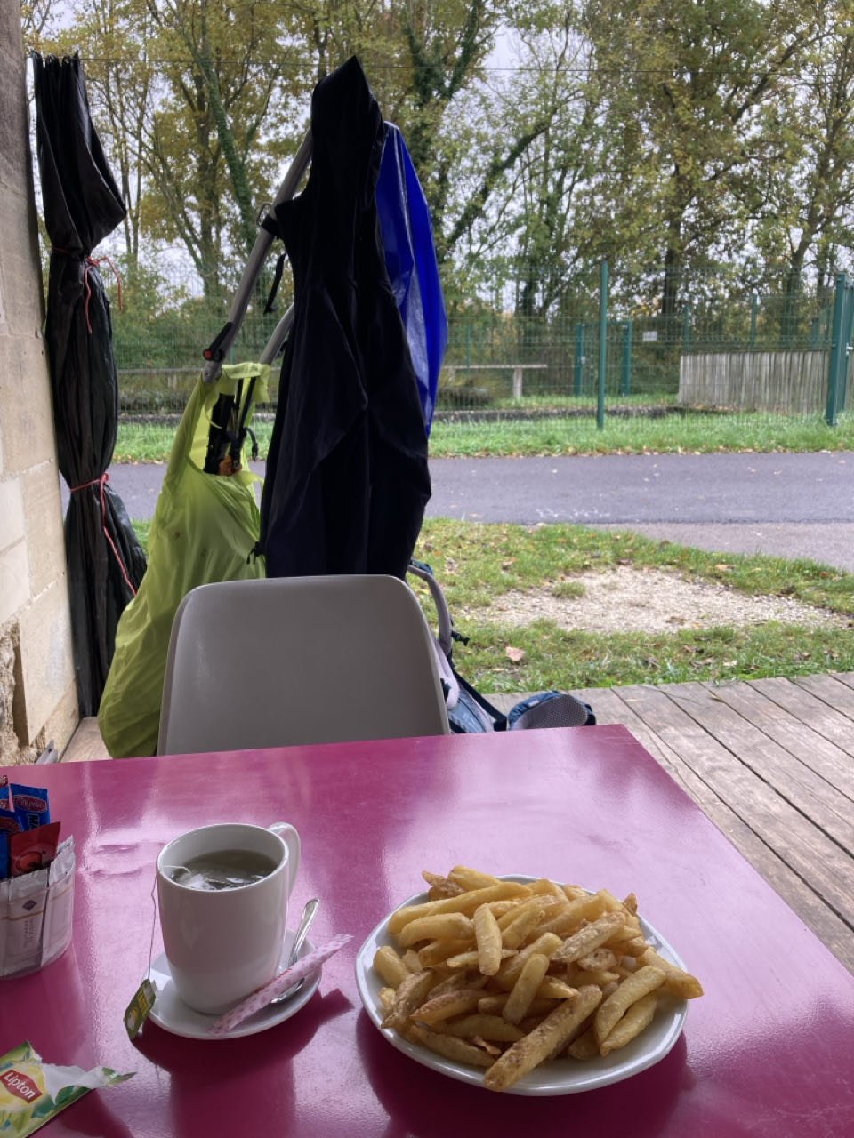 Vers 13h. J’arrive devant une écluse qui semble en bon état et c’est… un petit resto ! 🍟 Je commande et grande assiette de frites que je mange en regardant le canal. Trop bien !