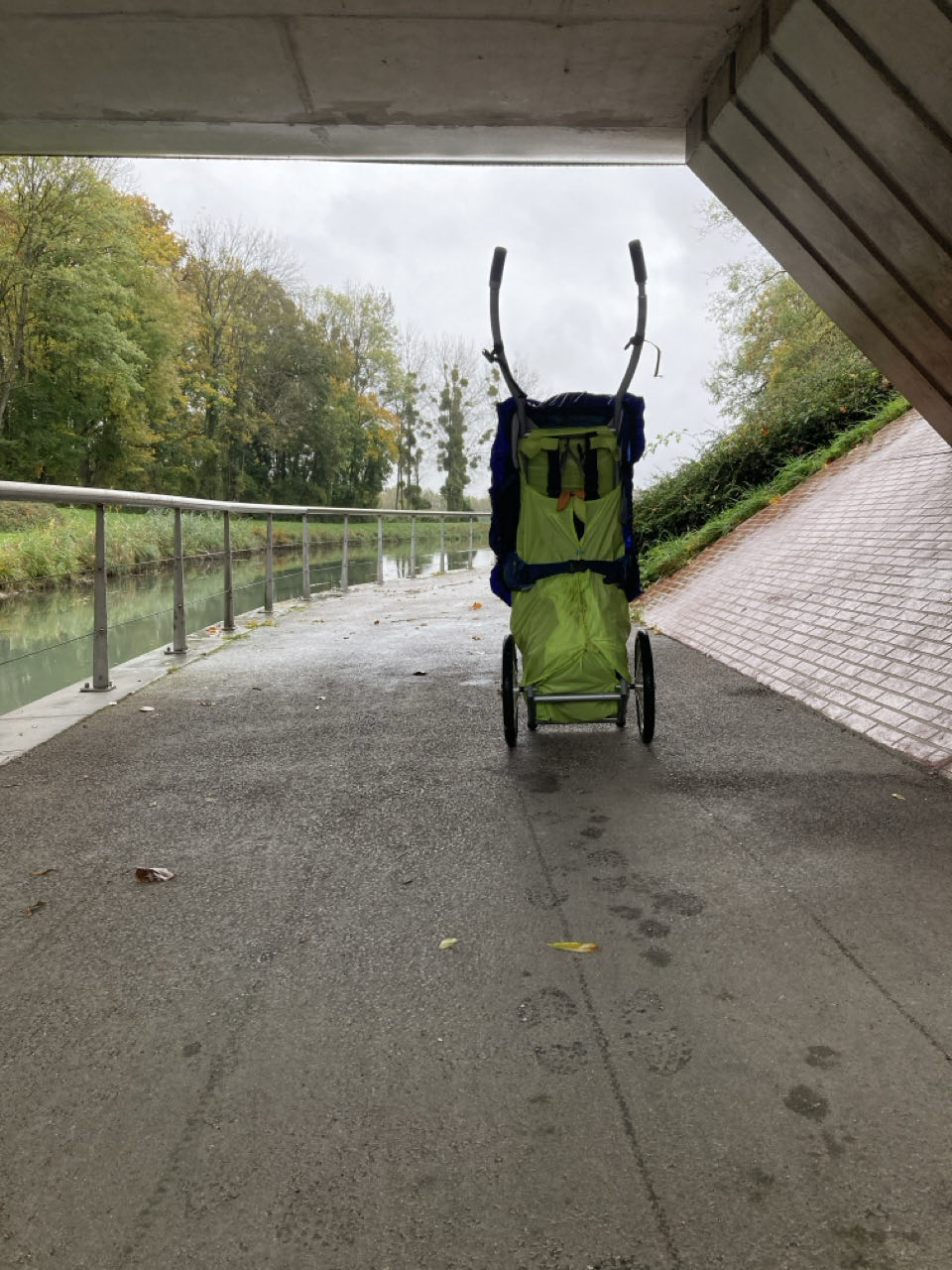 Il pleut depuis mon départ de Méry. 🌧️ Une pluie fine qui mouille, mais pas trop. Heureusement, il ne fait pas froid. Je fais des pauses à l’abri sous les ponts.
