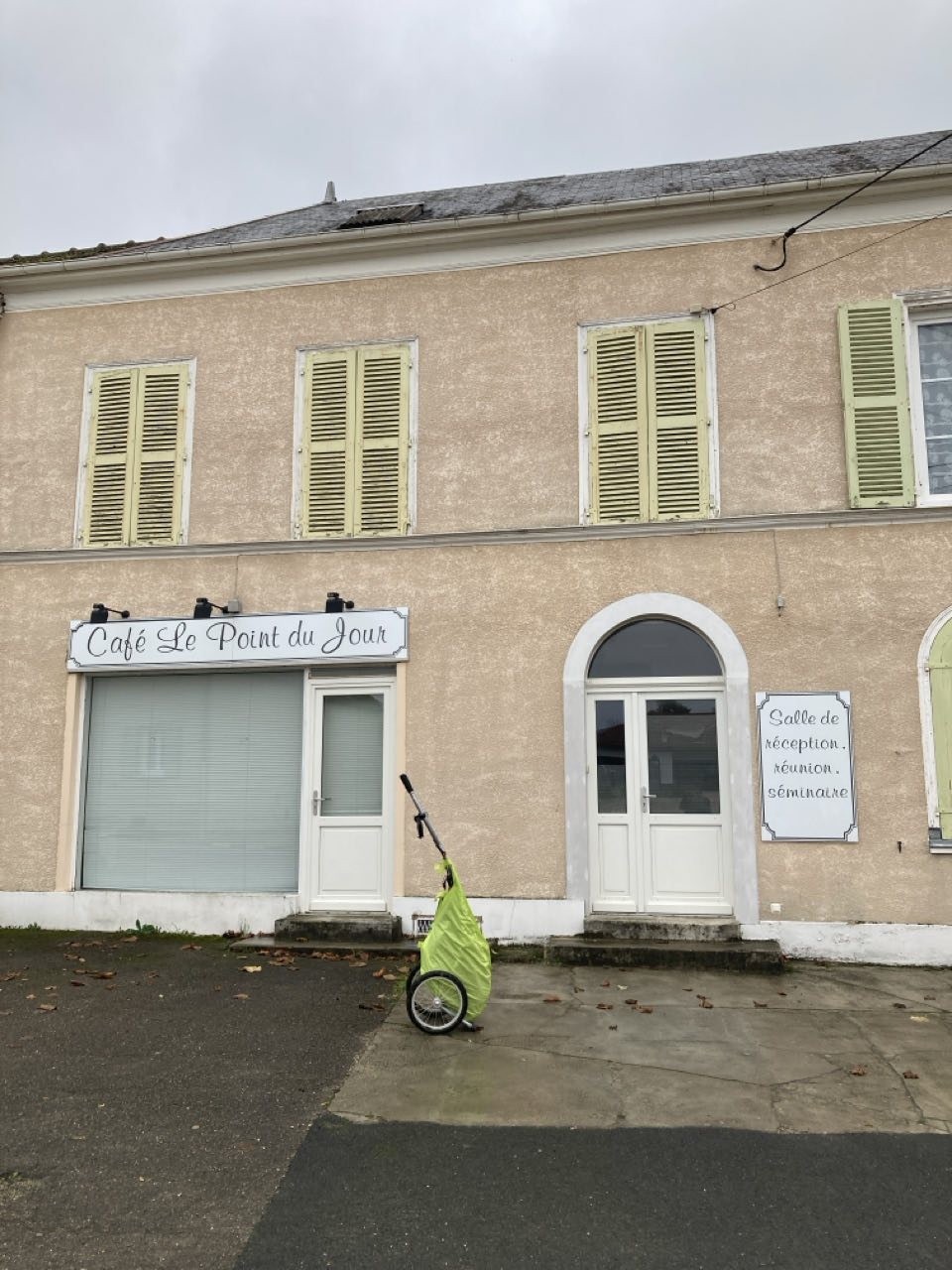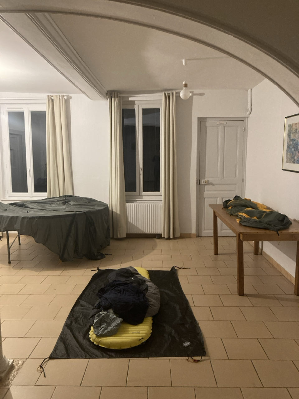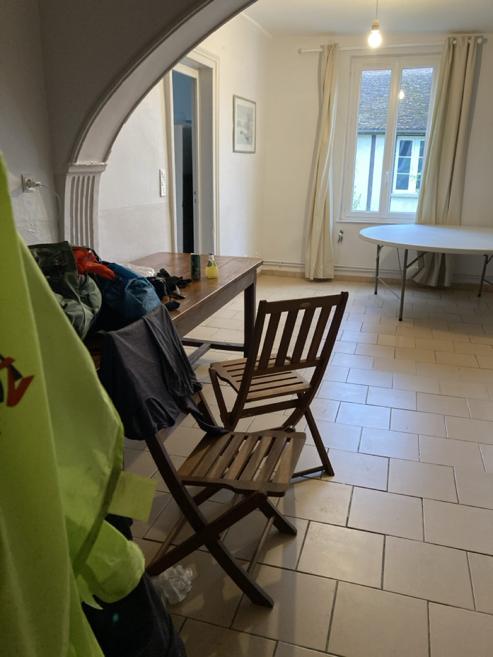 Richard me précise qu’il a déjà été plusieurs fois jusqu’à Compostelle et me propose de dormir dans la salle des fêtes. 🥳 Pas de lit ni de douche, mais ça me convient parfaitement ! J’ai accès à des toilettes et à la cuisine. Je m’installe et je fais sécher ma tente. Merci Richard !