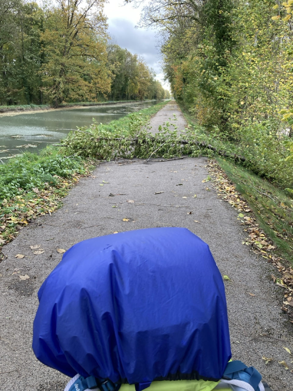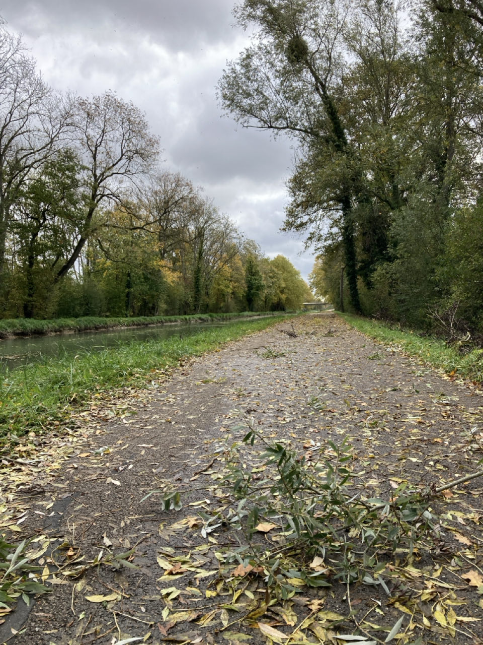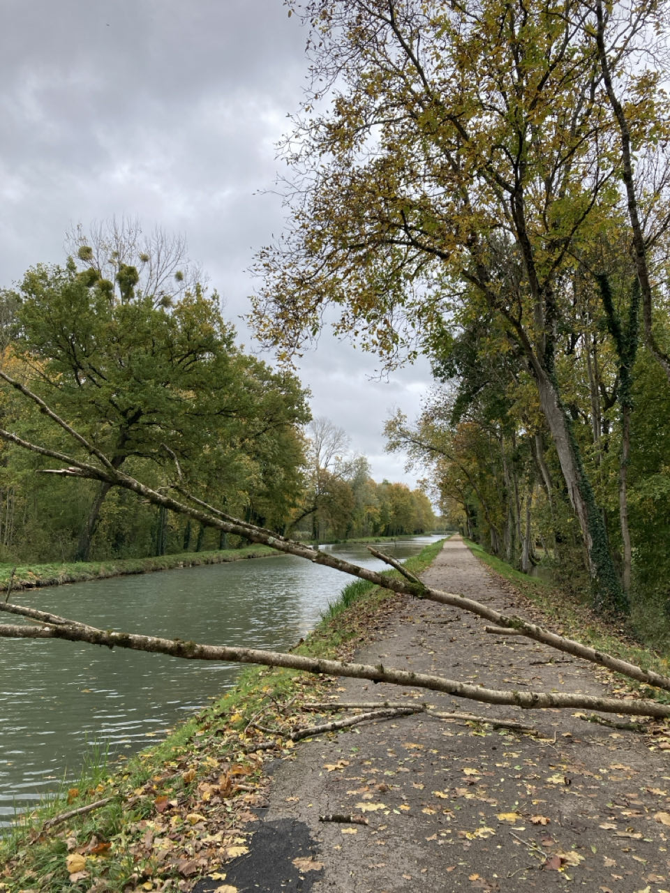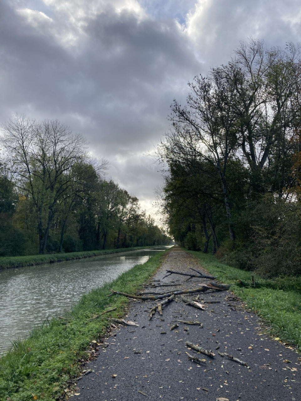 Brindilles et branchages s’amassent sur la piste cyclable. Les feuilles jaunes des peupliers tapissent le sol et la surface du canal. Un arbre s’écrase quelques secondes après mon passage. J’avance à l’écoute de ce vent violent. Je guette le moindre craquement inhabituel.
