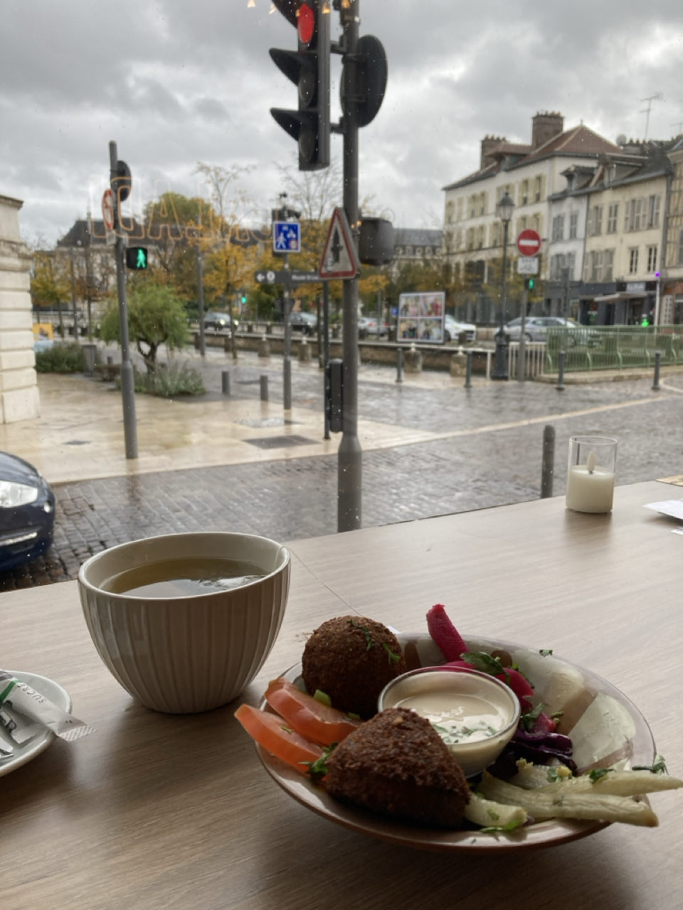 14h30. Troyes. J’avance au hasard à la recherche d’un café pour me réchauffer. J’arrive au Baladi, un salon de thé et restaurant libanais. La dame est moyennement aimable en me voyant arriver trempée et j’insiste pour rentrer avec Rouletab. Je commande un thé et à manger.
