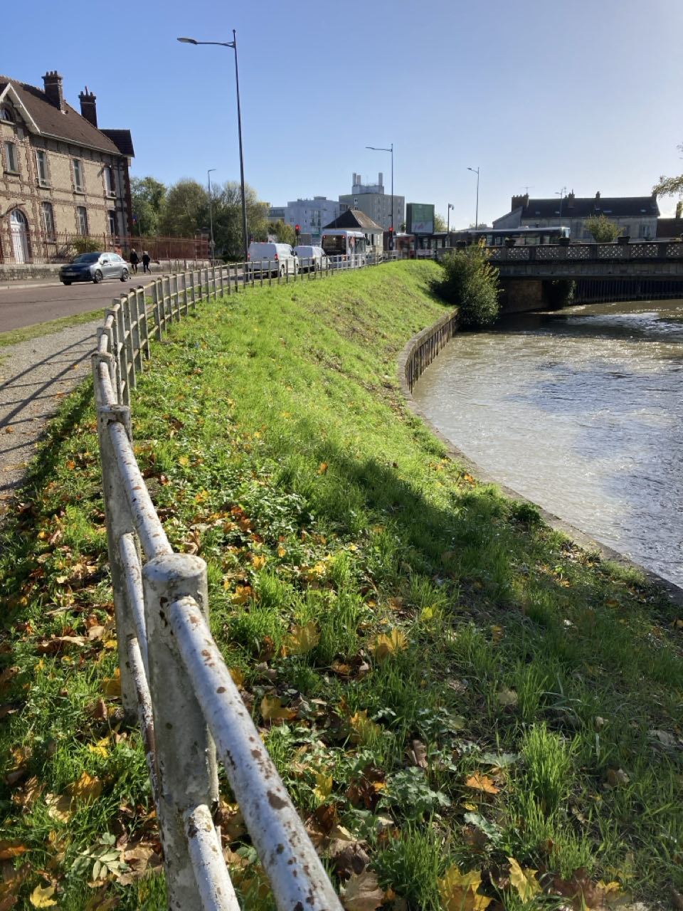 Je retrouve tout de même le fleuve en passant par le canal. Je longe l’arc de cercle de ce qu’on appelle le « bouchon de champagne ». 🍾 Vu du ciel, le vieux centre de Troyes ressemble à un bouchon de champagne (voir photo). Pratique pour une cité qui était la capitale des comtes de… Champagne ! 😂