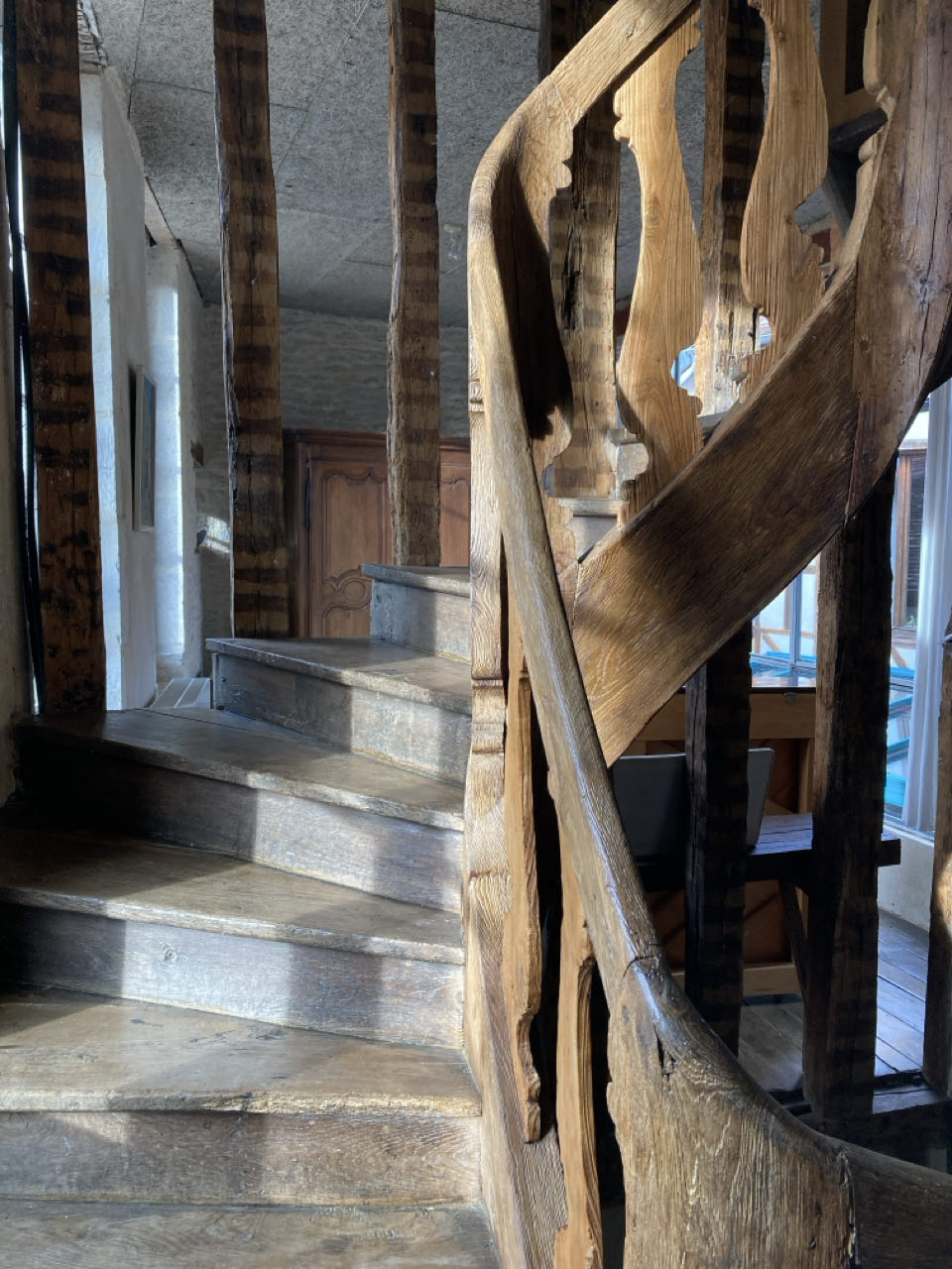 J’ai une chambre sous les toits et des chaussons pour marcher dans cette grande maison chatillonnaise. En réalité, plusieurs maisons ont été regroupées. Au début, je m’y perdais un peu. Quelques pièces seulement sont chauffées. Les vieilles pierres et les escaliers en bois sculptés me font penser que ces murs ont une histoire. Quand je lui demande, Françoise me dit que certaines parties datent sûrement du 17ème siècle. 😲