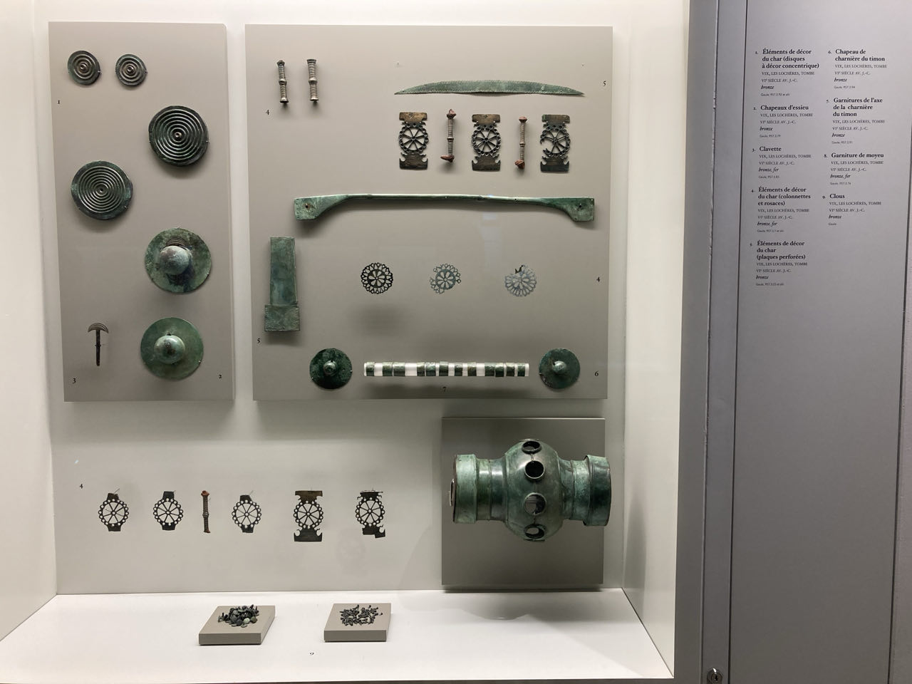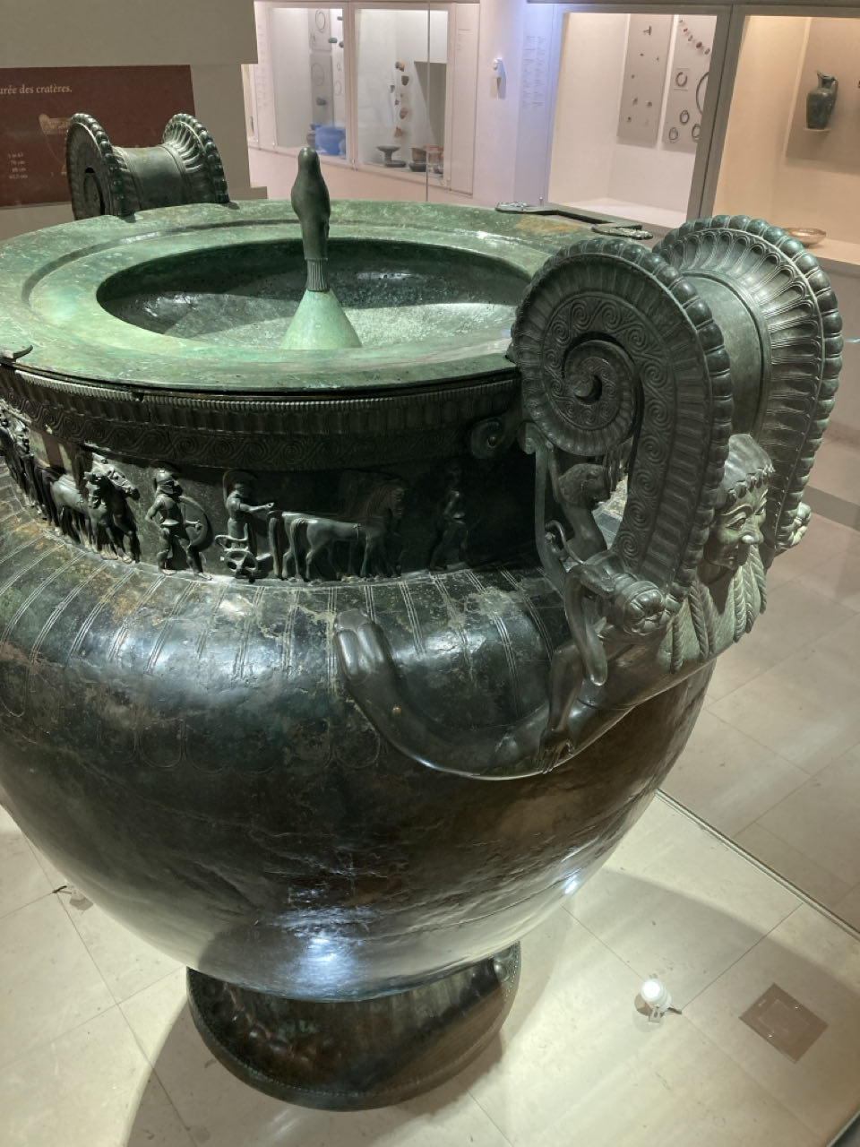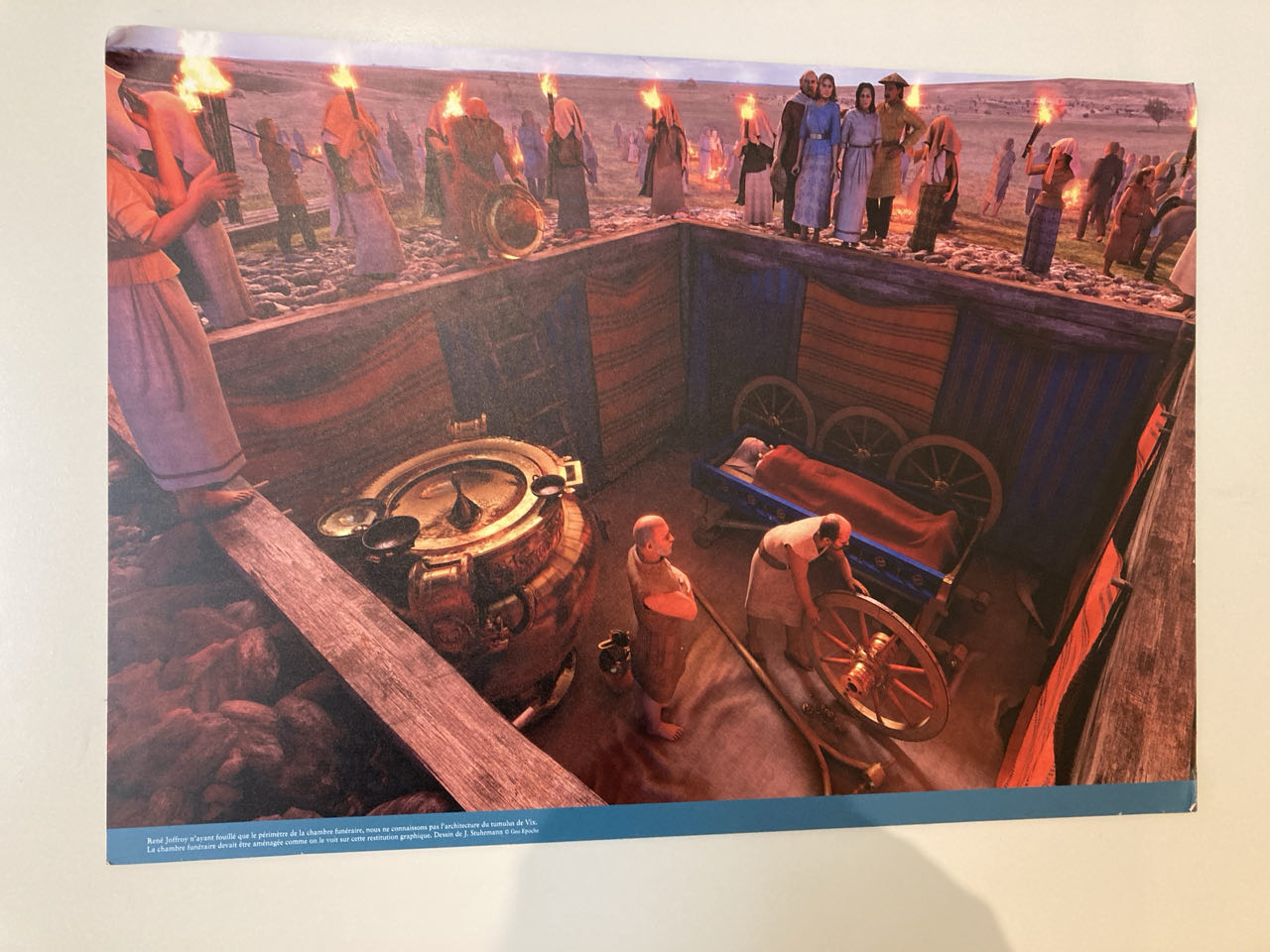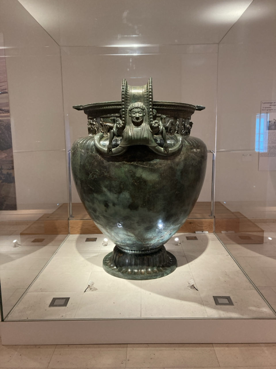 La puissance et la richesse de l'aristocratie dominante établie au mont Lassois lui permet de constituer des sépultures d'un luxe exceptionnel. Y’a notamment ce cratère (vase) monumental en bronze d’1m63 ! 😲 et pleins d’autres objets épatants (torque en or pur, céramiques, bijoux en bronze, restes du char).