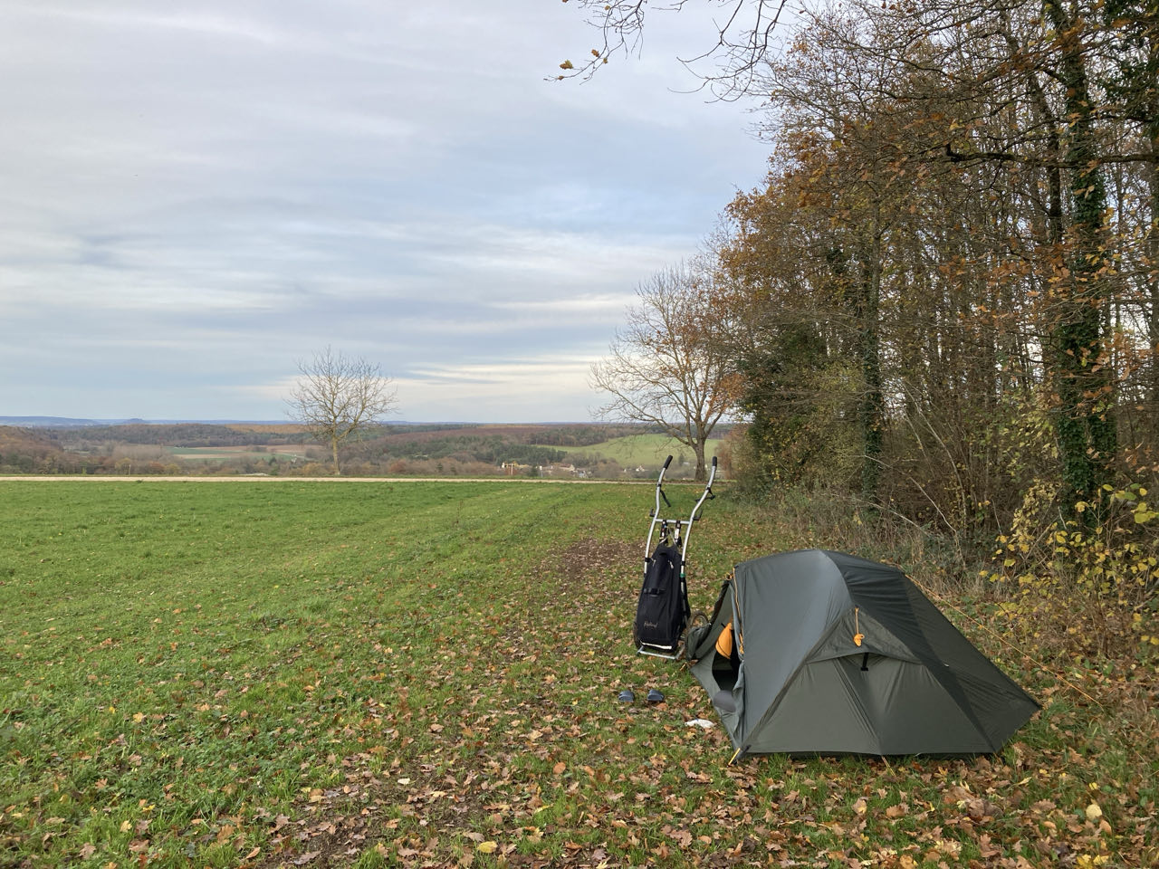 17h50. Mon camp est rangé. J’ai mangé. Ma tente est ouverte. Je regarde dehors avec mon sac de couchage sur les genoux. De grosses chauve-souris volent au-dessus de la tente. 🦇 En face, un tracteur laboure son champ avec de phares puissants. 🚜 À gauche, le ciel est encore légèrement rose. À droite, la vallée de la Seine est dans la pénombre. La route nationale est bien empruntée, je vois pleins de phares !