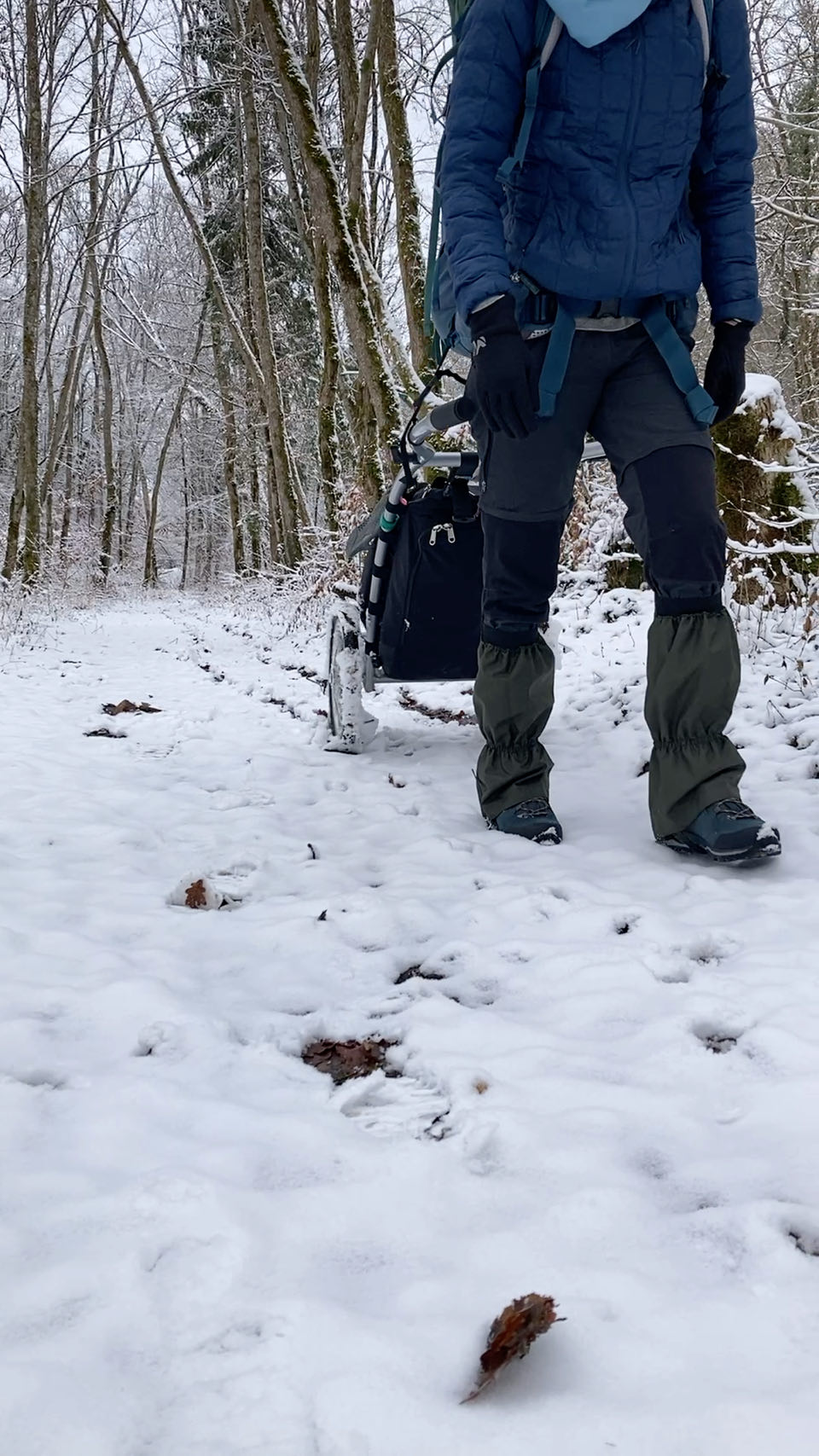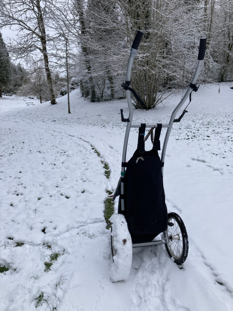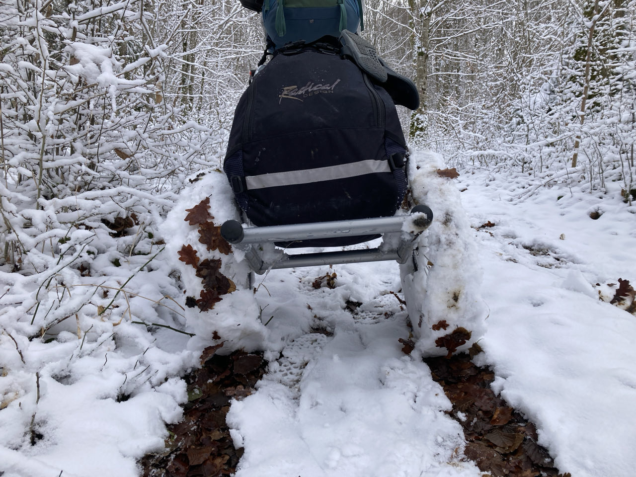 La neige s’agglutine sur les roues de Rouletab qui s’alourdit encore plus… Elle colle au sol alors qu’elle pèse déjà 25 kg… Pour une reprise, c’est fatiguant.