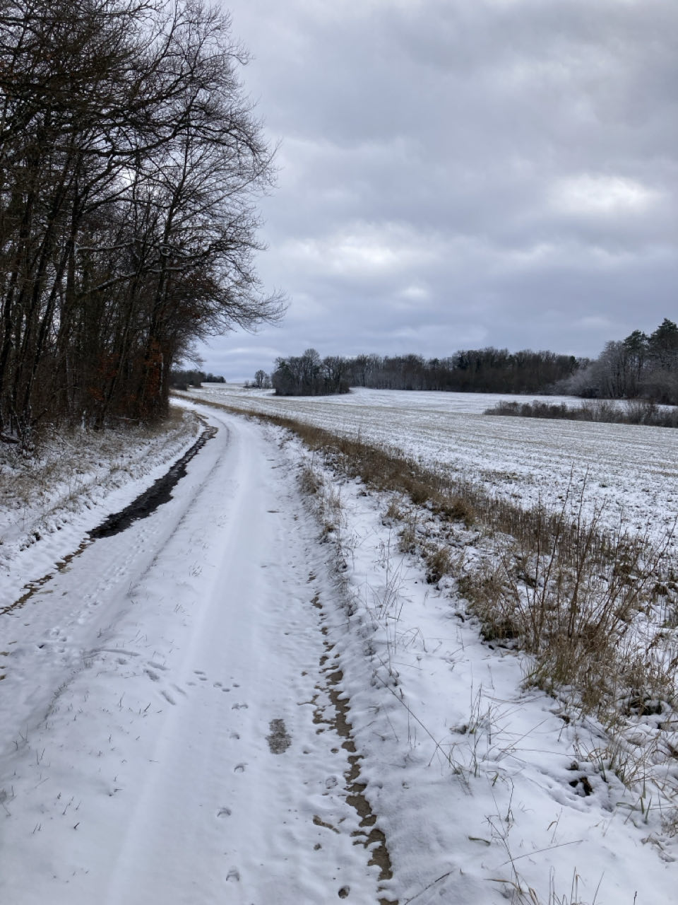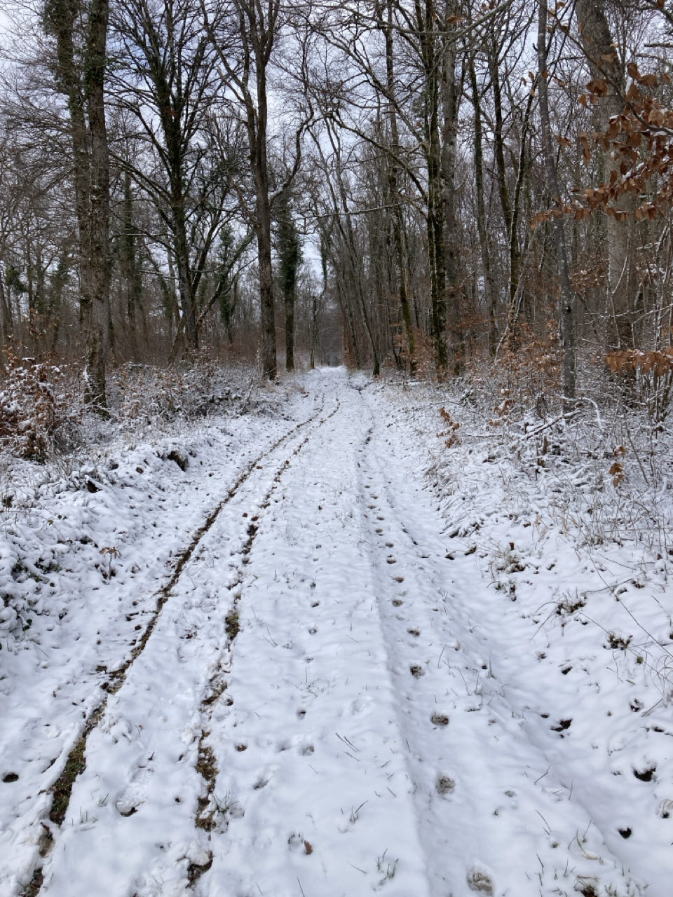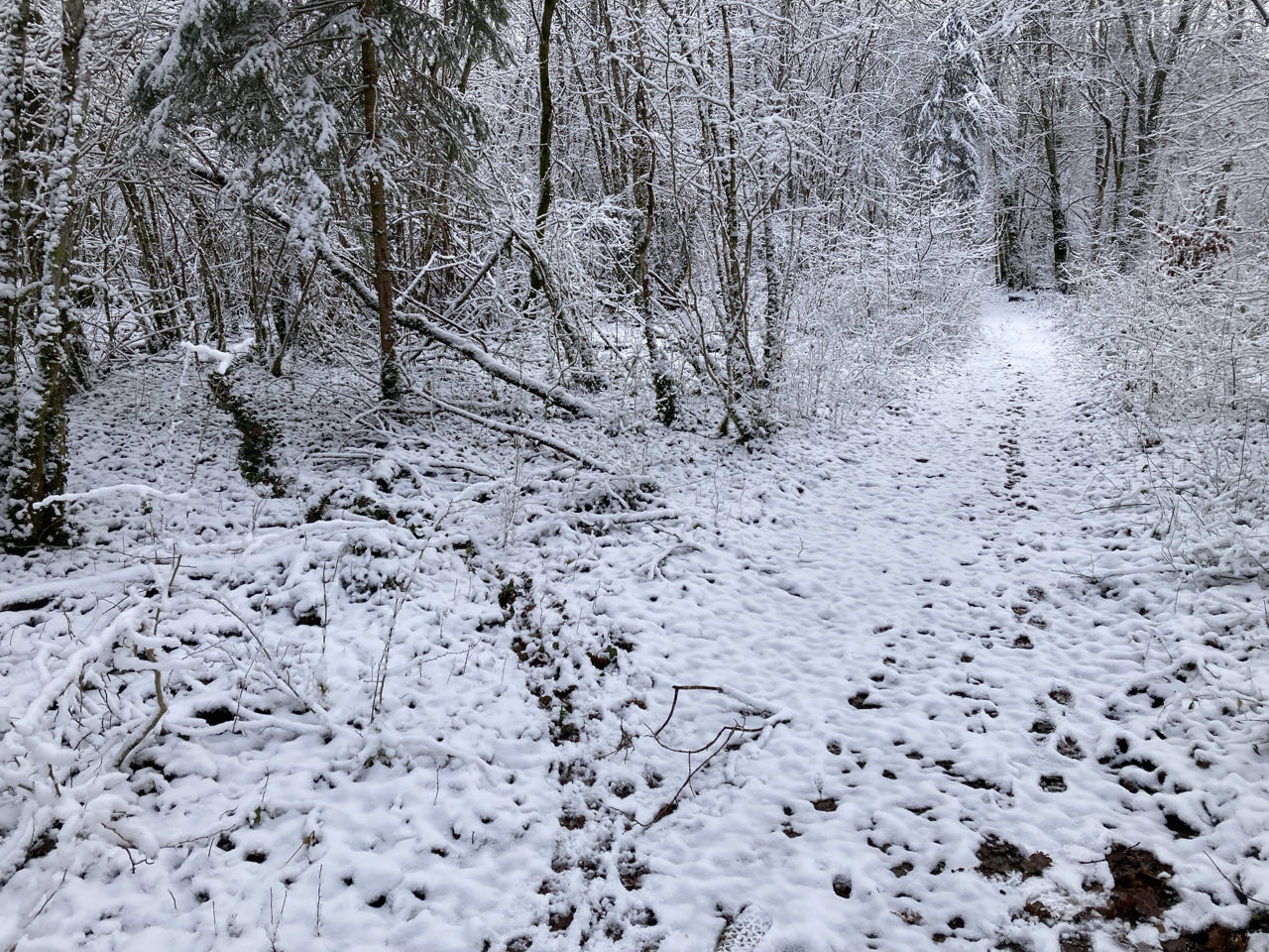 Aucune trace humaine mais beaucoup d’empreintes. Lièvre, chevreuil, faisan, sanglier, blaireau, renard. Selon les espèces, les déplacements ne sont pas les mêmes : certaines suivent le sentier que j’utilise moi aussi, d’autres le traverse seulement.