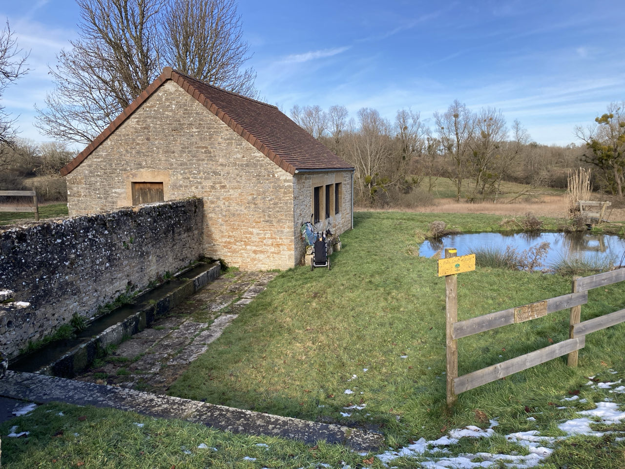 14h. Vent frais mais les températures remontent. Pause au soleil devant le lavoir de Panges. ☀️ Un minuscule pont en bois passe au-dessus du ruisseau. Je bricole mes guêtres et nettoie mon matelas plein de terre de ce midi. J’hésite à m’arrêter pour la nuit, mais je décide de continuer.